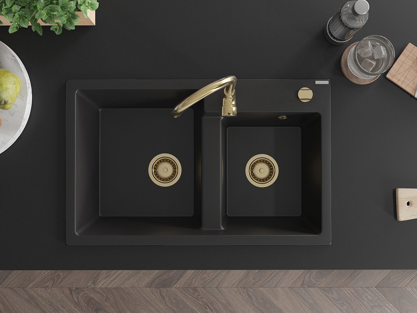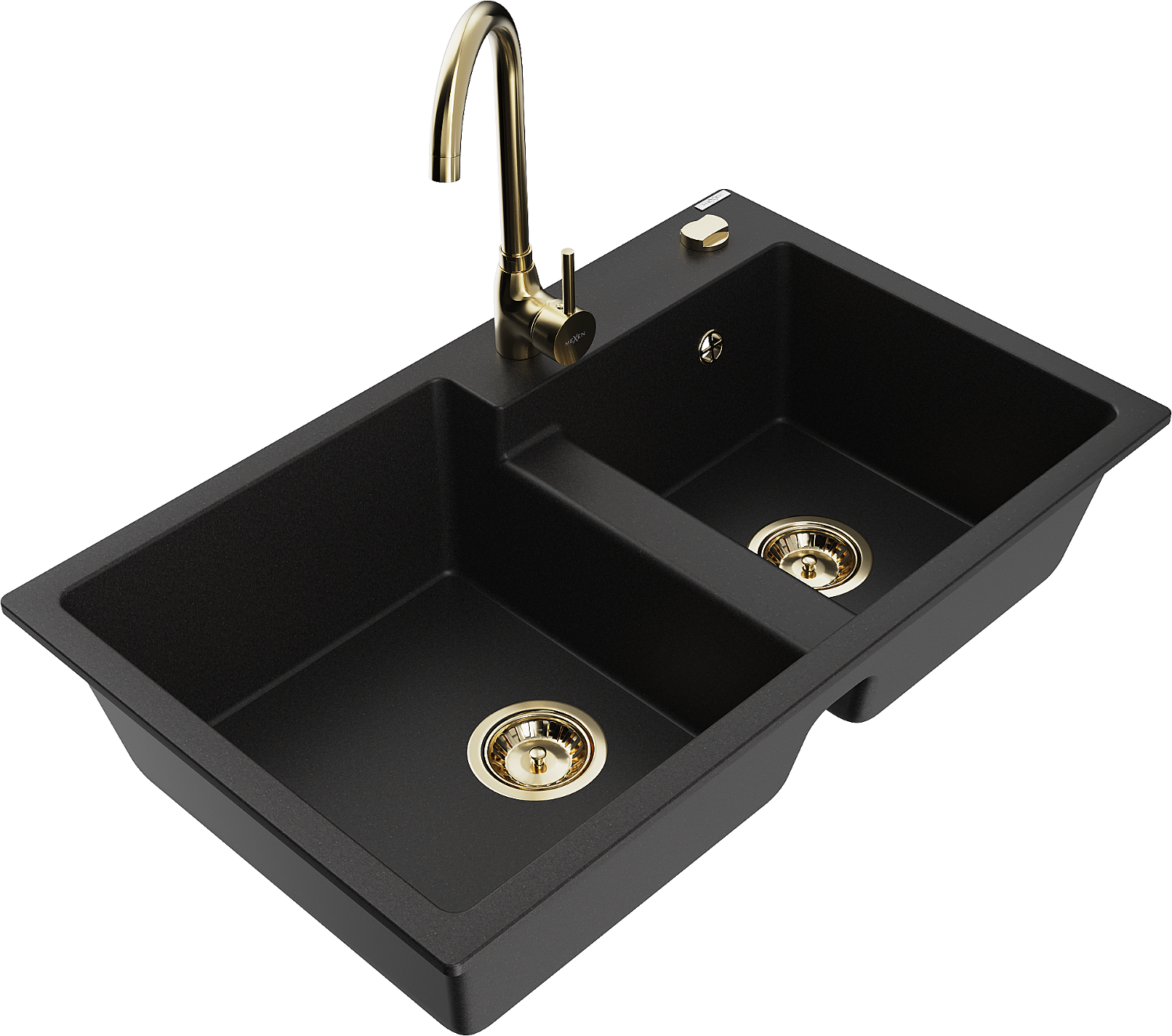 Mexen Tomas dviejų skyrių granito kriauklė su virtuviniu maišytuvu Telma, juoda - 6516-77-670200-50