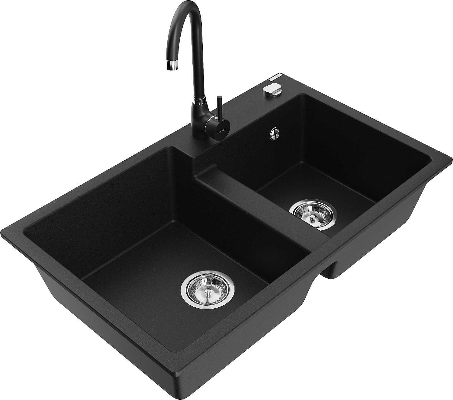 Mexen Tomas granito plautuvė su dviem kameromis ir virtuviniu maišytuvu Telma, juoda - 6516-77-670200-70