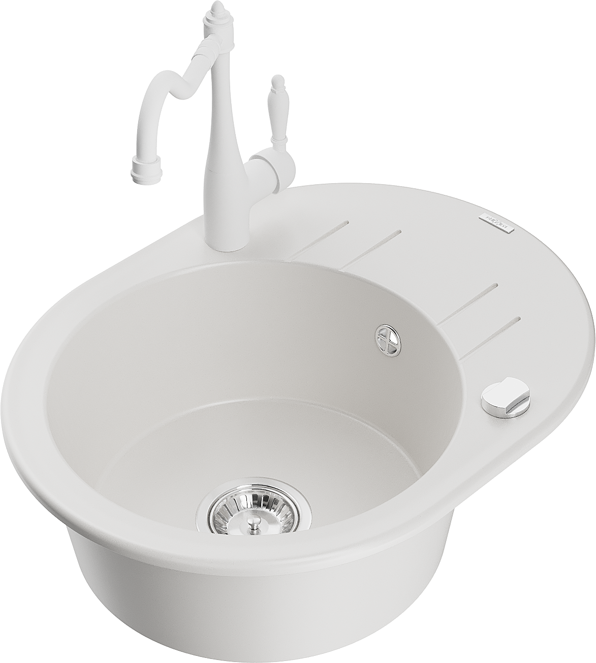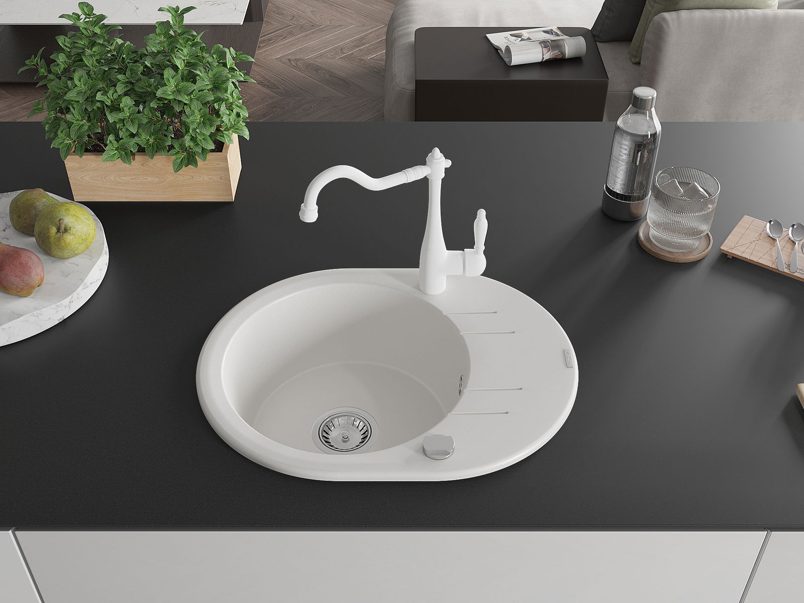 Mexen Kevin granitinė kriauklė su viena kamera, nuvarvėjimo plokštuma ir virtuvės maišytuvu Carla, balta - 6517-20-670700-20