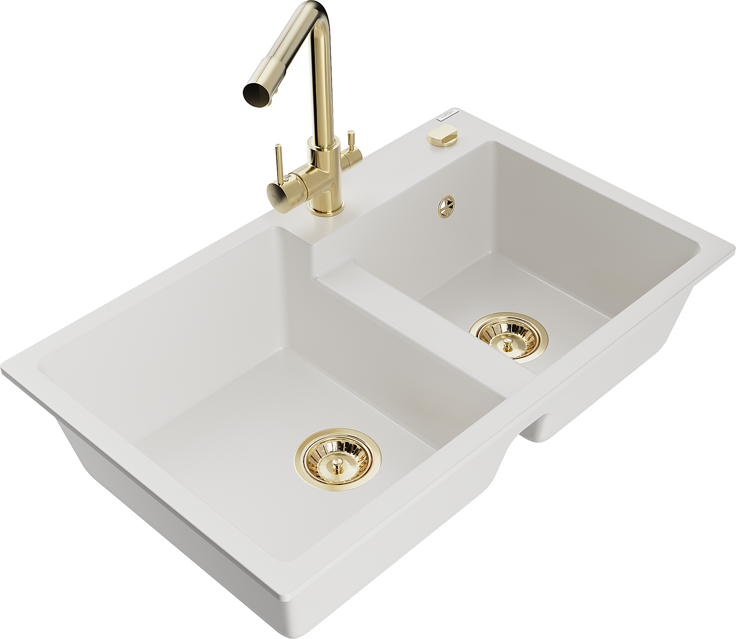 Mexen Tomas granitinis dviejų skyrių plautuvės komplektas su virtuviniu maišytuvu Duero, baltas - 6516-20-671600-50