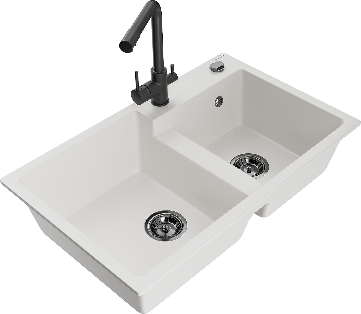Mexen Tomas granitinė dviejų skyrių kriauklė su Duero virtuviniu maišytuvu, balta - 6516-20-671600-70