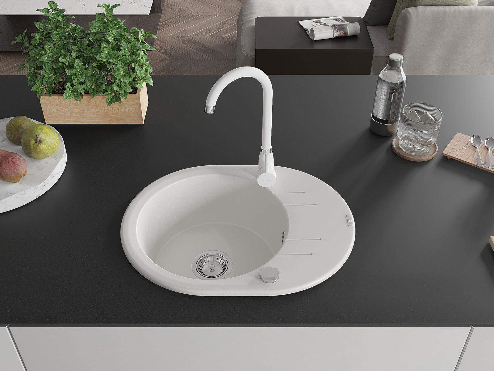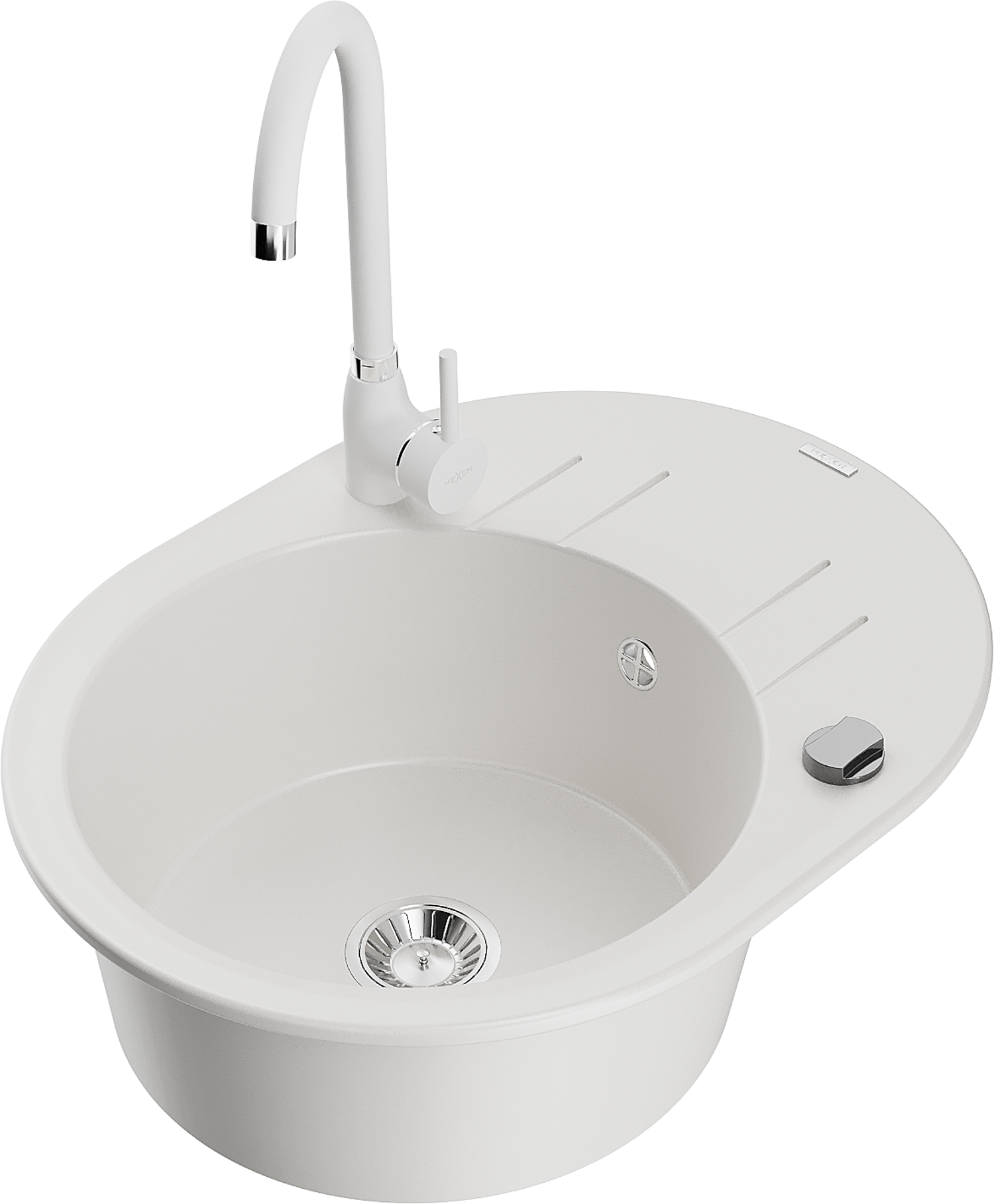 Mexen Kevin granito plautuvė 1 skyrelio su nutekamąja dalimi ir virtuviniu maišytuvu Telma, balta - 6517-20-670200-20
