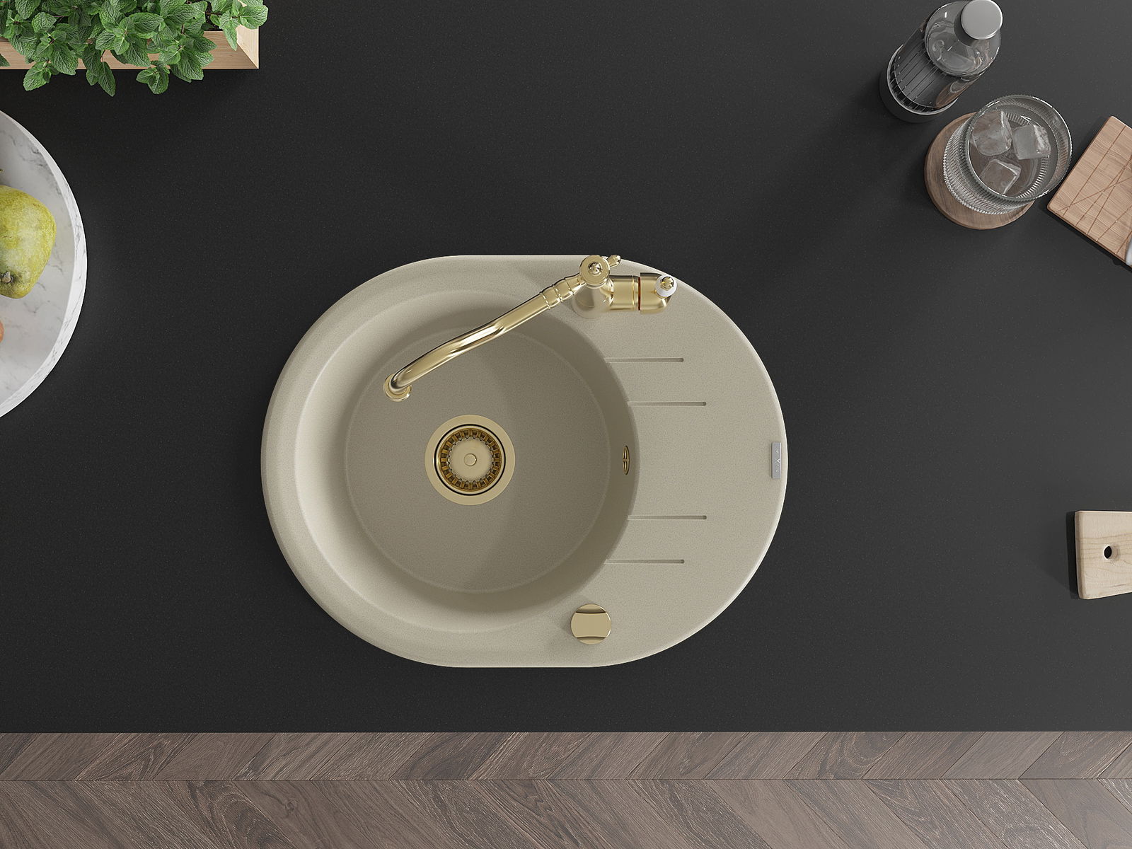 Kriauklė turi 2 iš anksto frezuotas skyles, kurių skersmuo yra 35 mm, skirtas savarankiškam išmušimui. Jas galima naudoti, pavyzdžiui, skysčio dozatoriaus montavimui, kuris pašalins plastikinių butelių buvimą virtuvėje ir suteiks jai elegantišką apdailą.