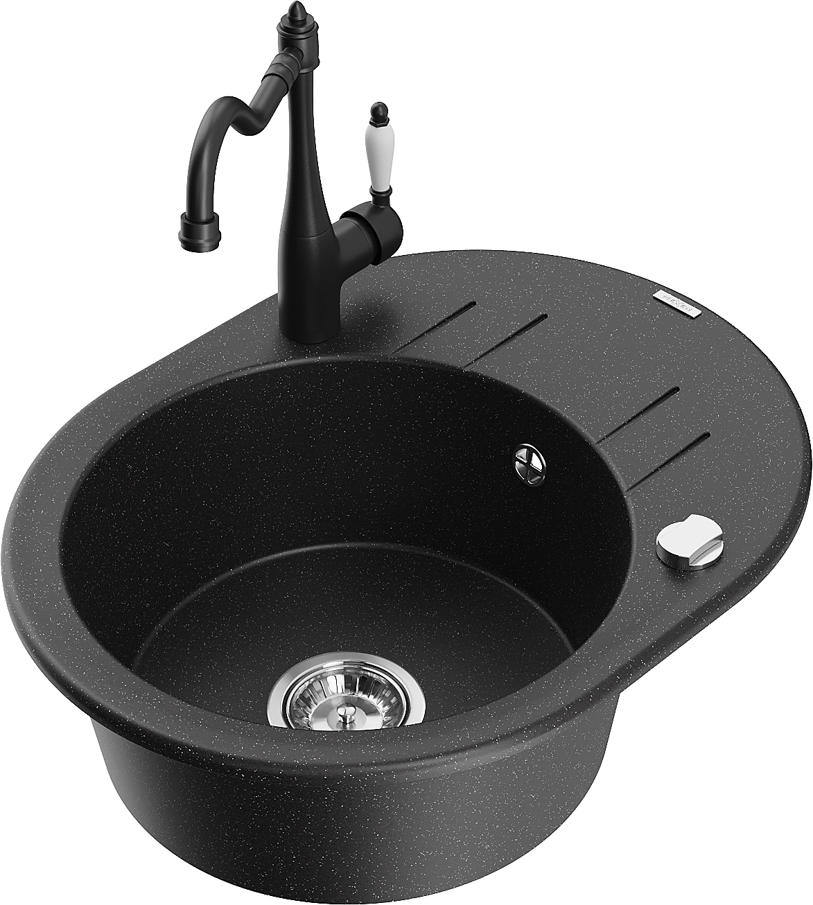 Mexen Kevin granitinė vienos kameros kriauklė su nusukikliu ir virtuviniu maišytuvu Carla, juoda/sidabrinis metalikas