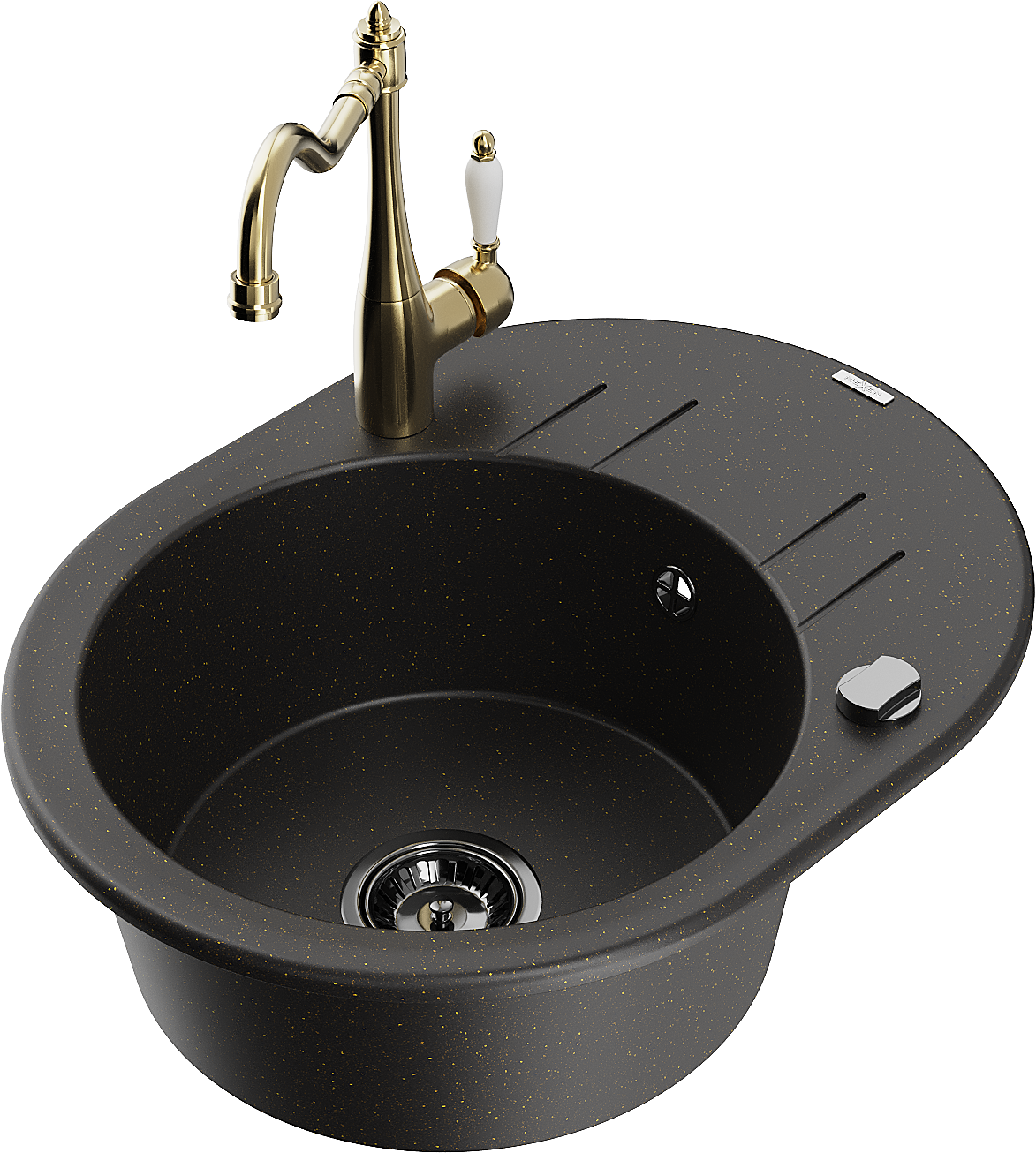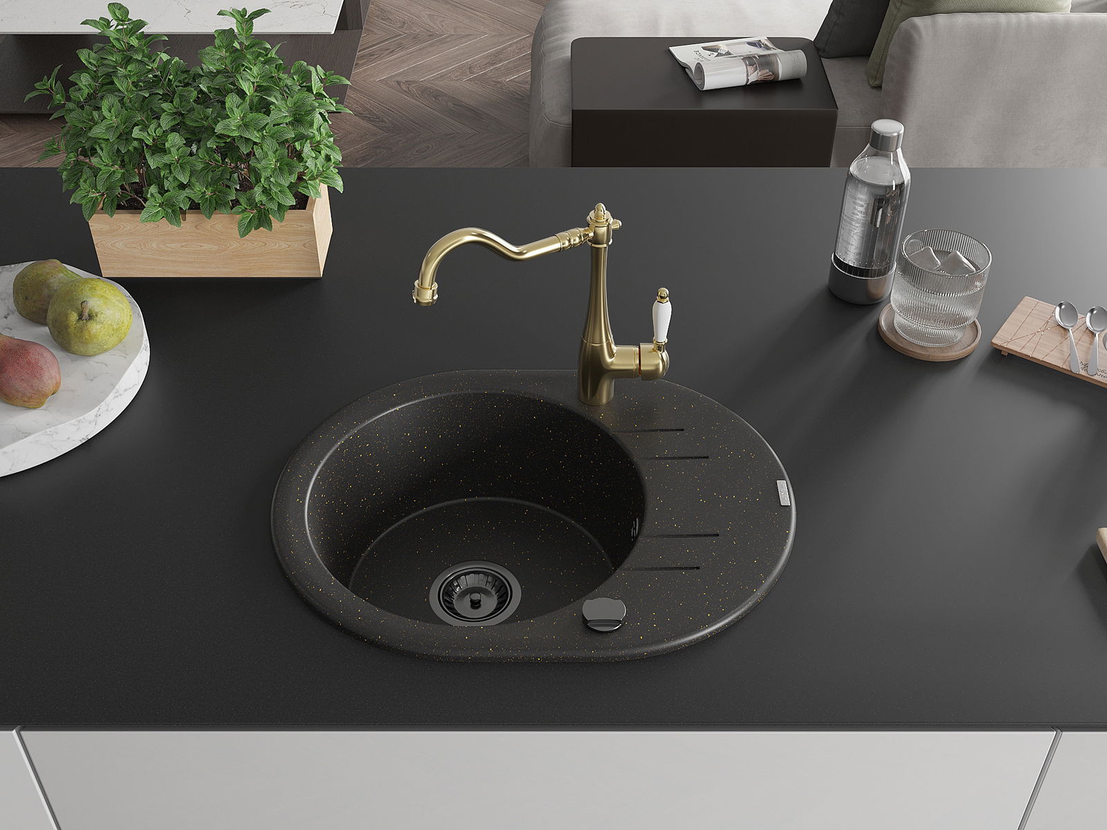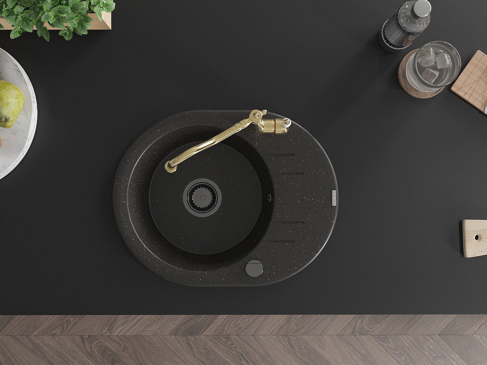 Mexen Kevin vienos komoros granitinė kriauklė su nuvarvėjimo plokšte ir virtuviniu maišytuvu Carla, juoda/auksinė metalo
