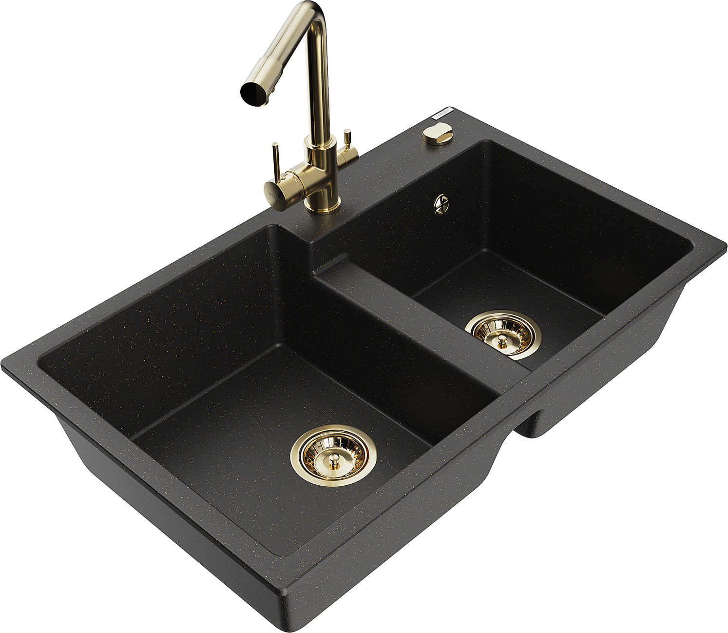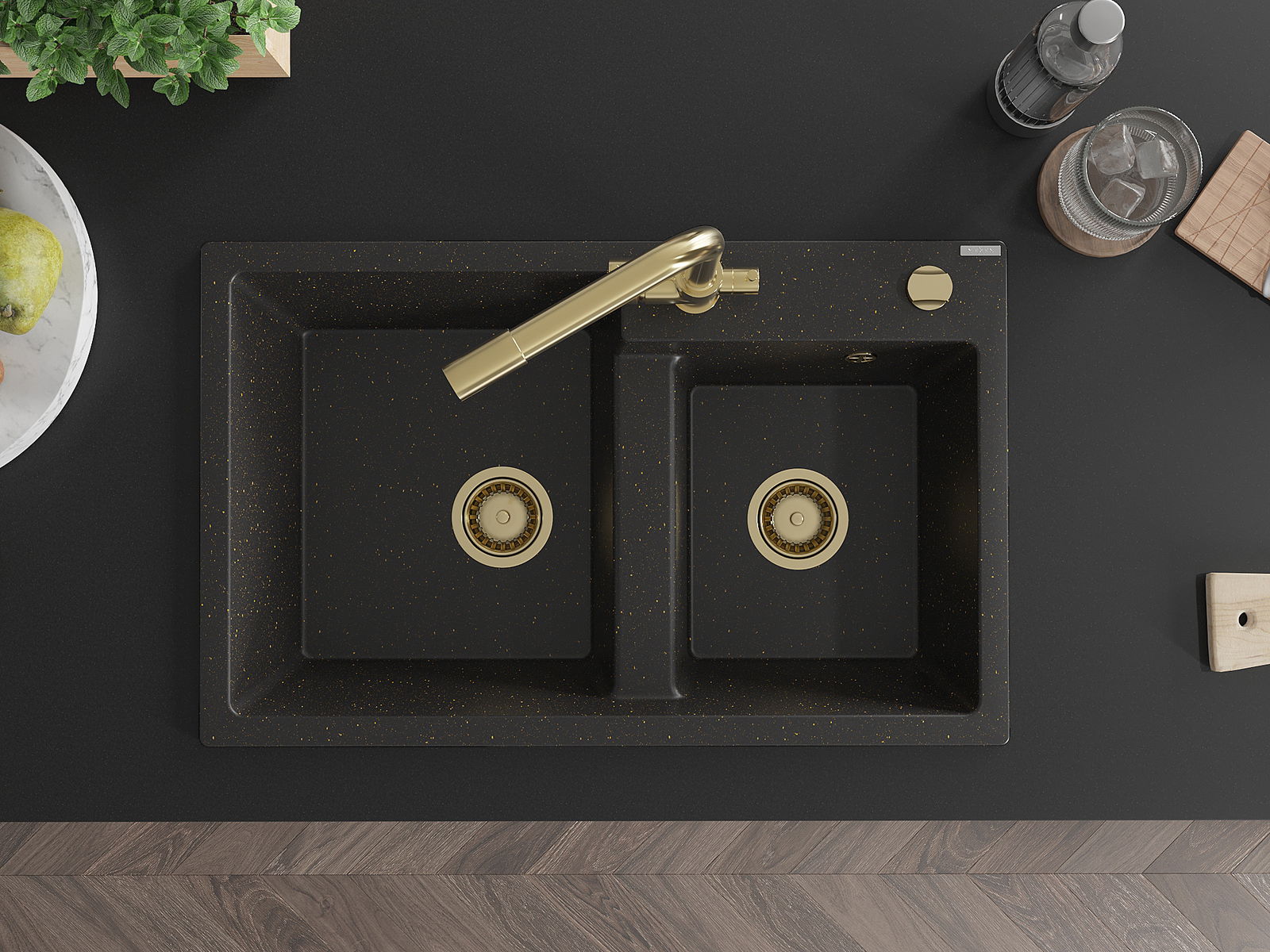 Mexen Tomas 2 skylių granitinis virtuvės plautuvė su Duero maišytuvu, juoda/auksinė metalik - 6516-75-671600-50