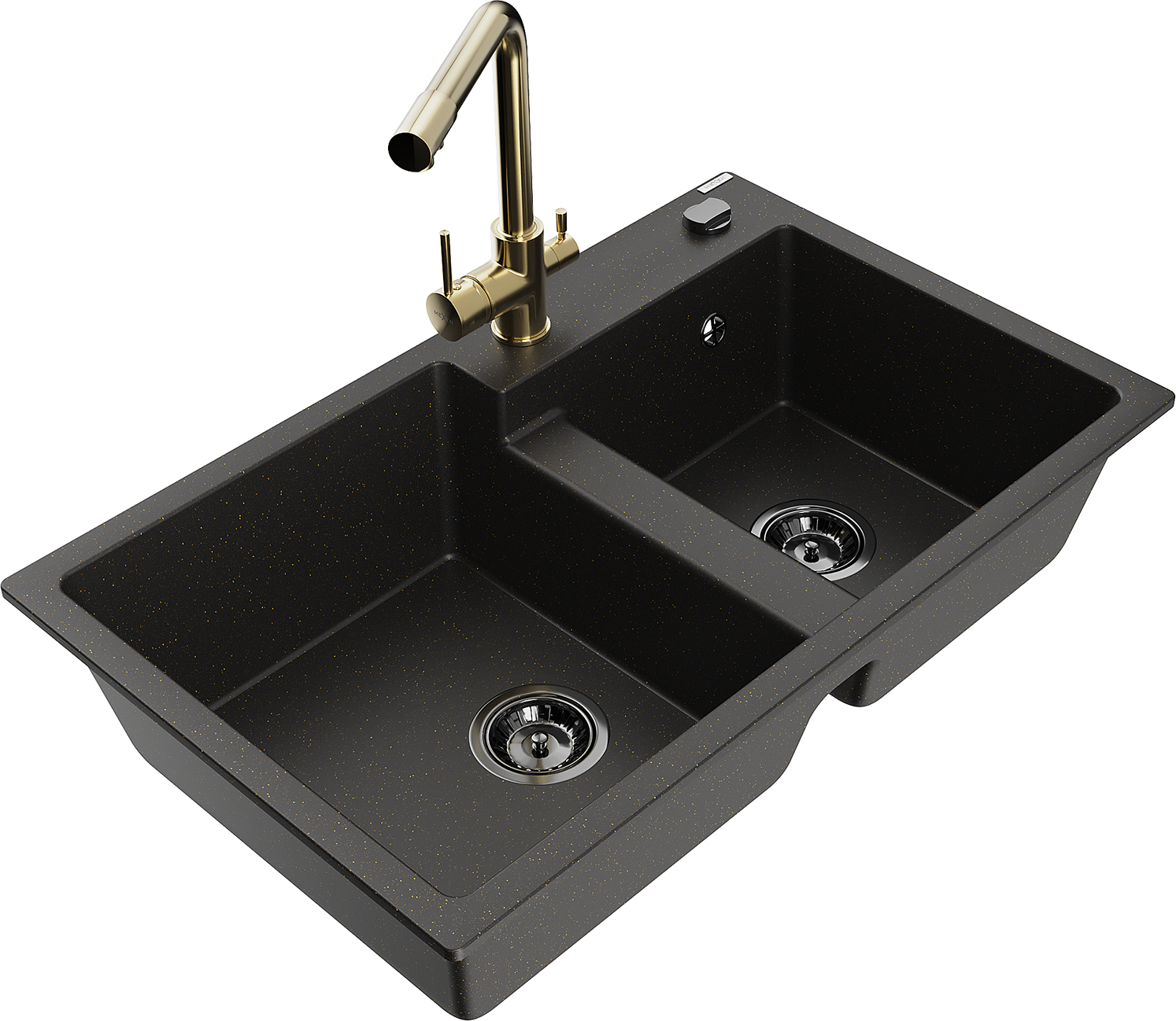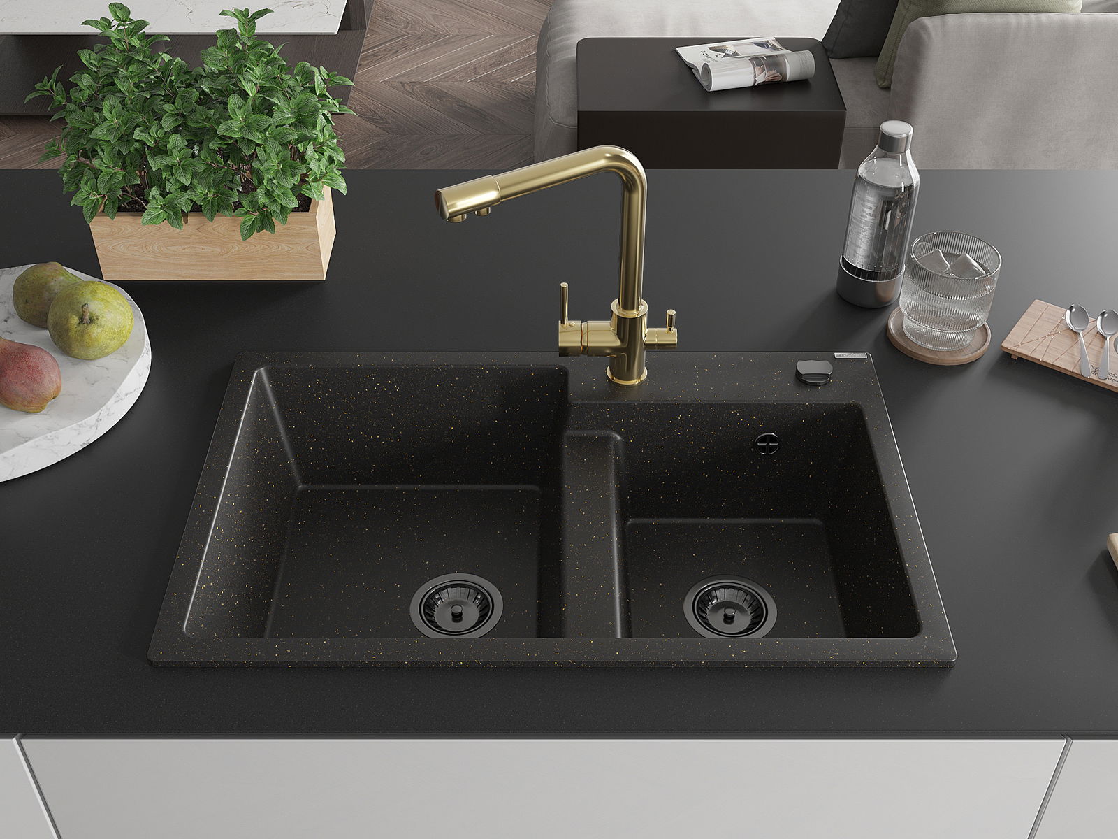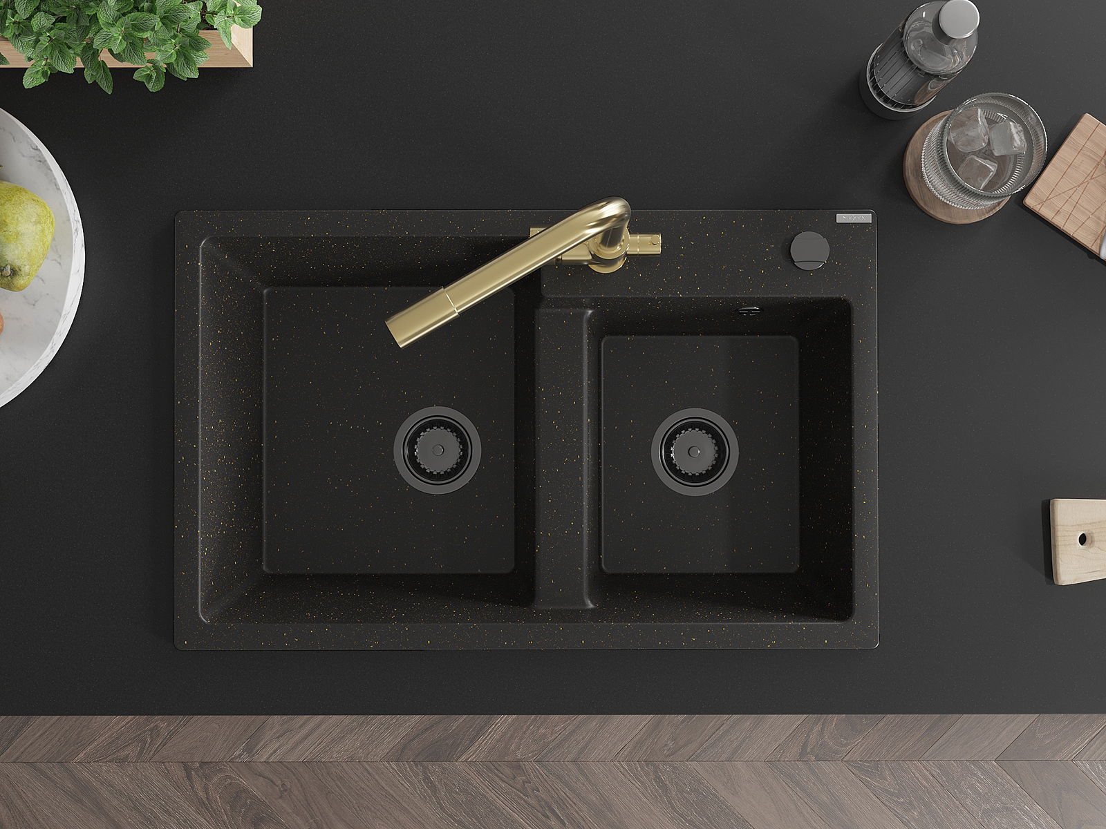 Mexen Tomas granito plautuvė su 2 kameromis ir Duero virtuviniu maišytuvu, juoda/auksinis metalikas - 6516-75-671600-50-B