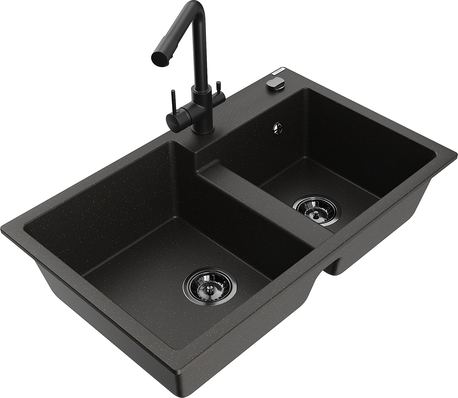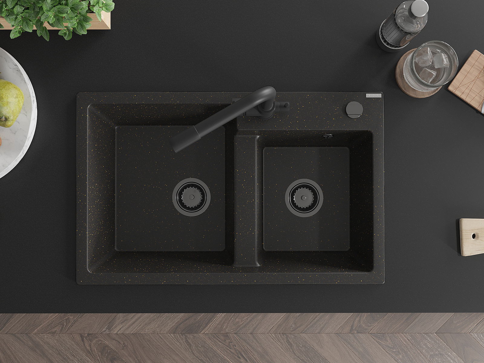 Mexen Tomas granito plautuvė dviejų kamerų su virtuviniu maišytuvu Duero, juodos/auksinio metalo spalvos - 6516-75-671600-70-B