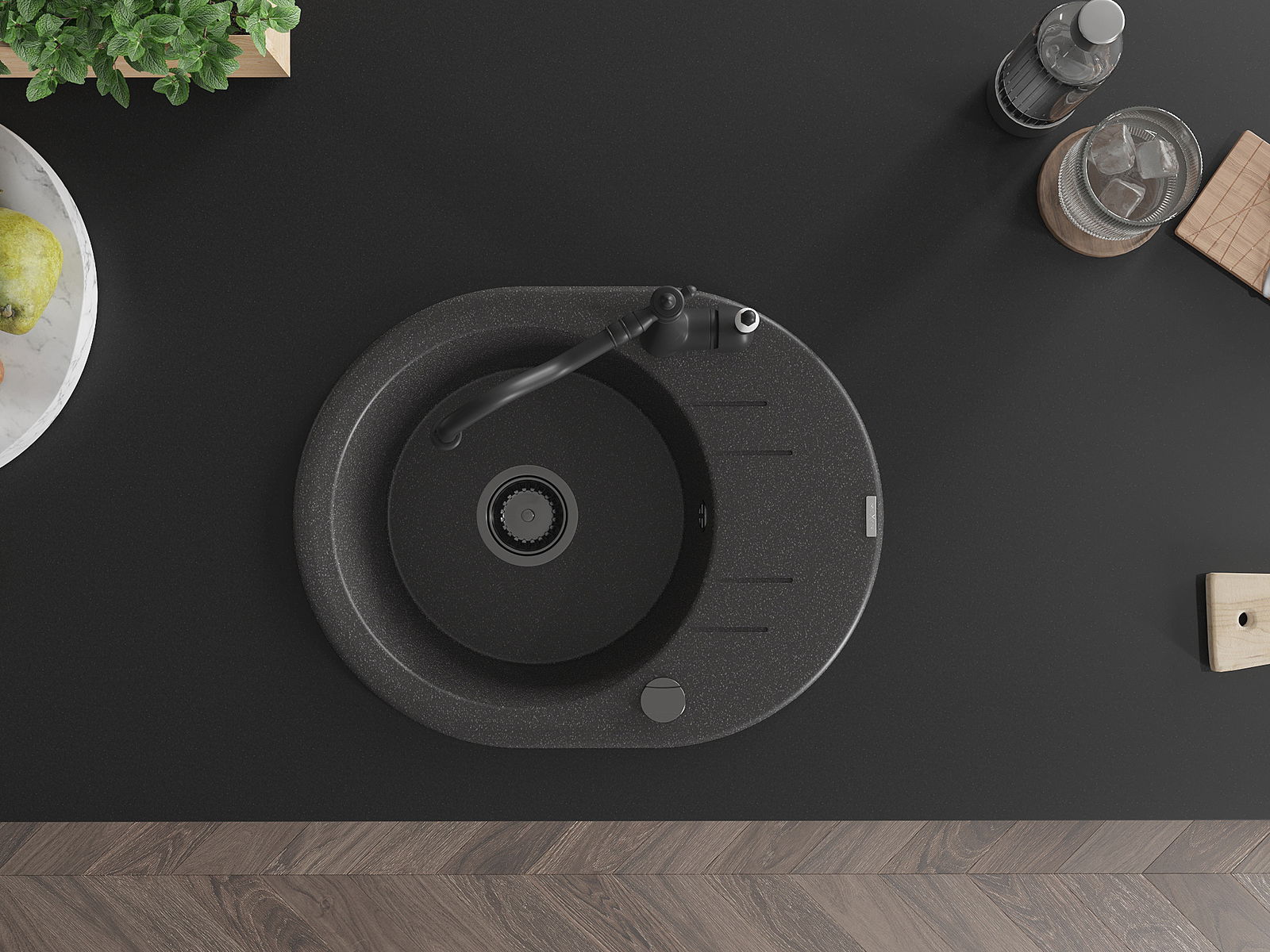 Kriauklė turi 2 iš anksto frezuotas skyles, kurių skersmuo yra 35 mm, skirtas savarankiškam išmušimui. Jas galima naudoti, pavyzdžiui, skysčio dozatoriaus montavimui, kuris pašalins plastikinių butelių buvimą virtuvėje ir suteiks jai elegantišką apdailą.
