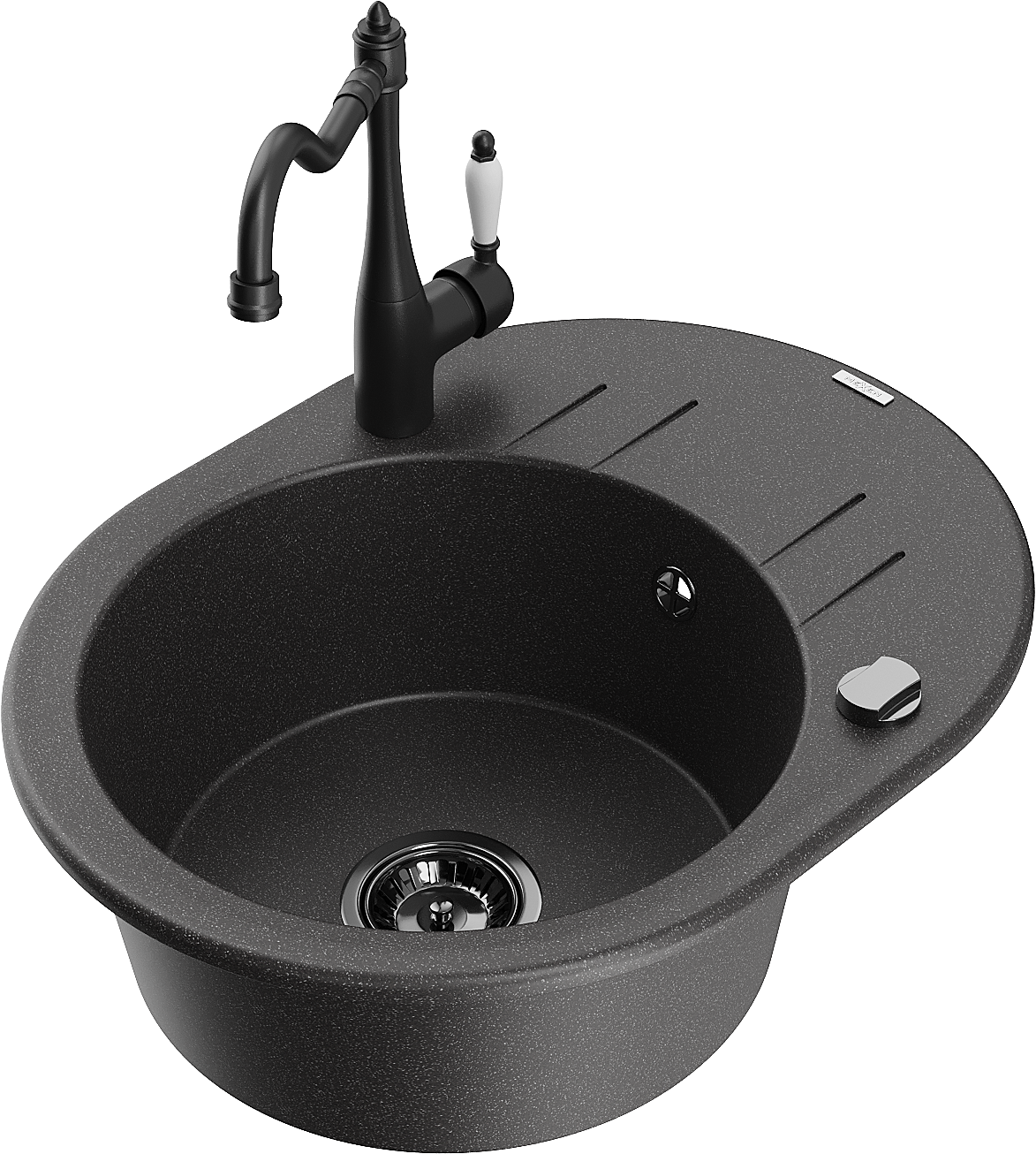 Mexen Kevin granitinė vienos kameros kriauklė su nuvarvėjimu ir virtuvės maišytuvu Carla, juoda su dėmėmis