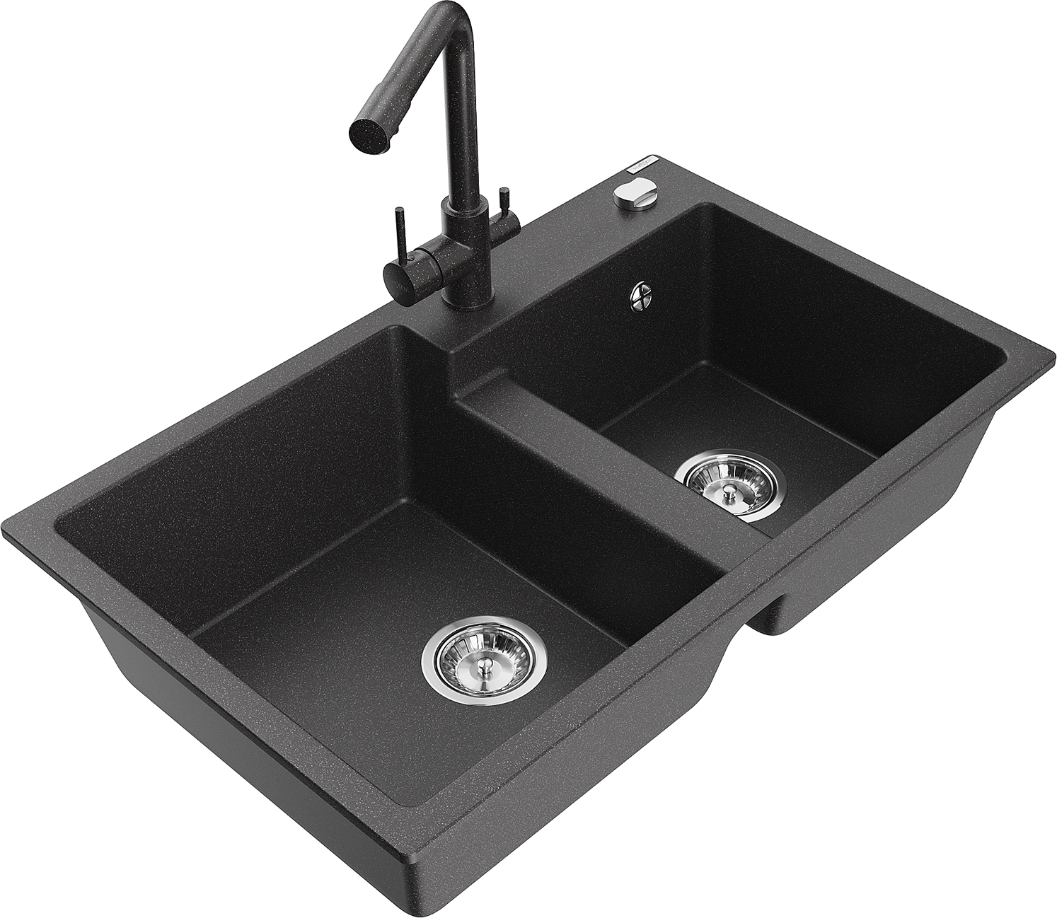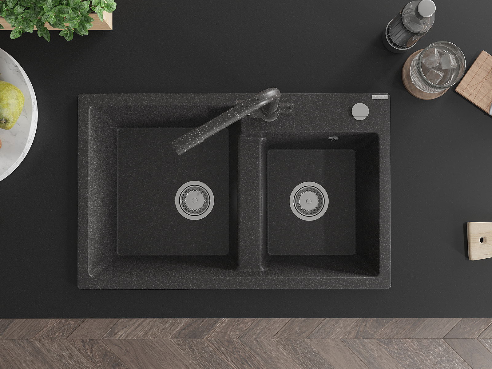 Mexen Tomas granitinė dviejų skyrių kriauklė su Duero virtuviniu maišytuvu, juoda dėmėta - 6516-76-671600-76