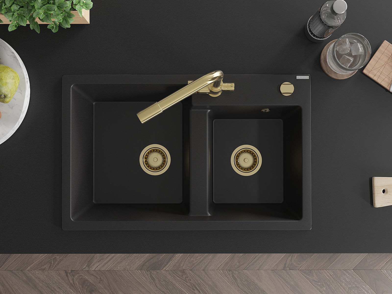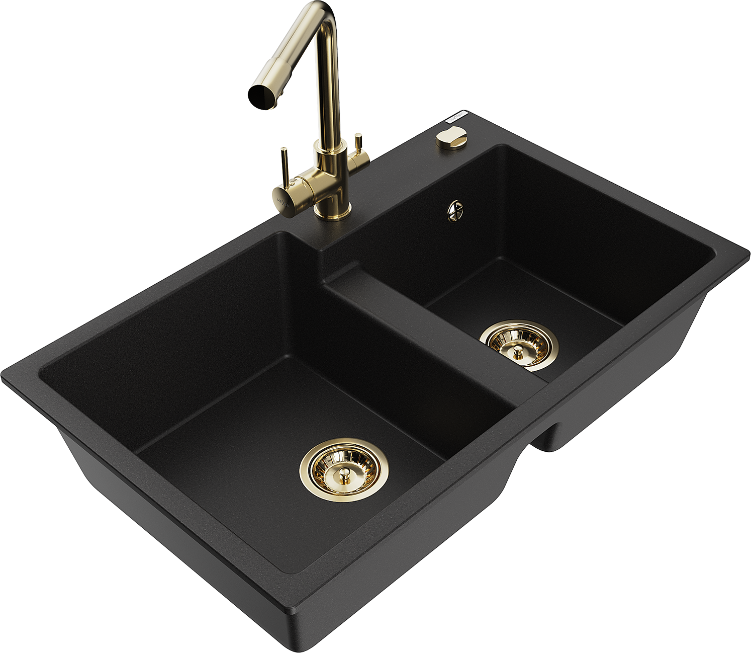 Mexen Tomas granitinė dviejų kamerų virtuvinė kriauklė su virtuviniu maišytuvu Duero, juoda - 6516-77-671600-50