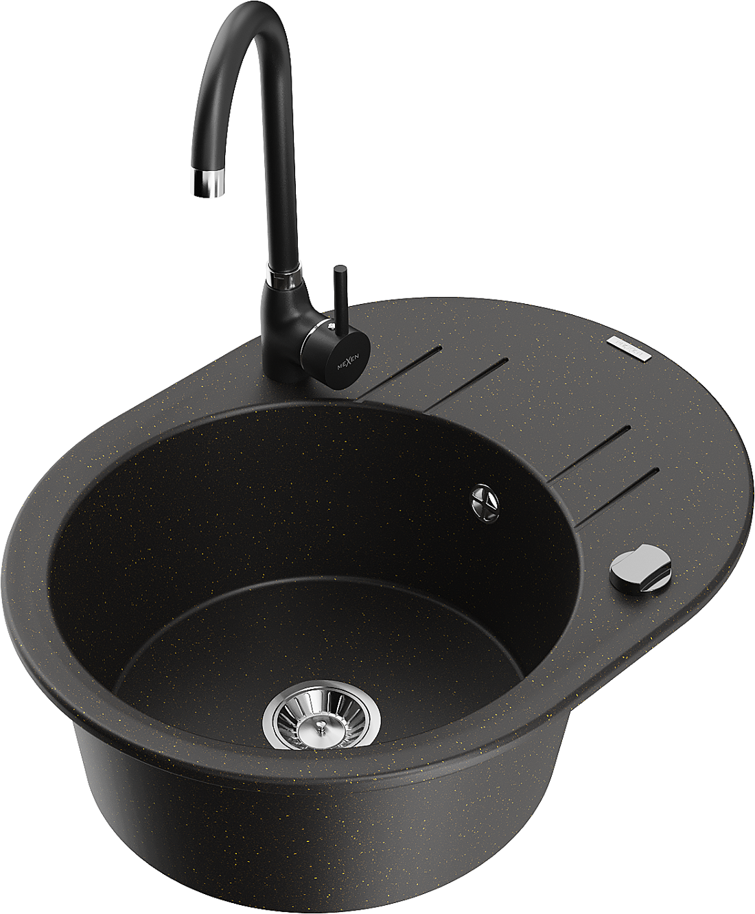 Mexen Kevin granitinė vienos kameros kriauklė su nusausintuvu ir virtuviniu maišytuvu Telma, juodas/auksinis metaliko