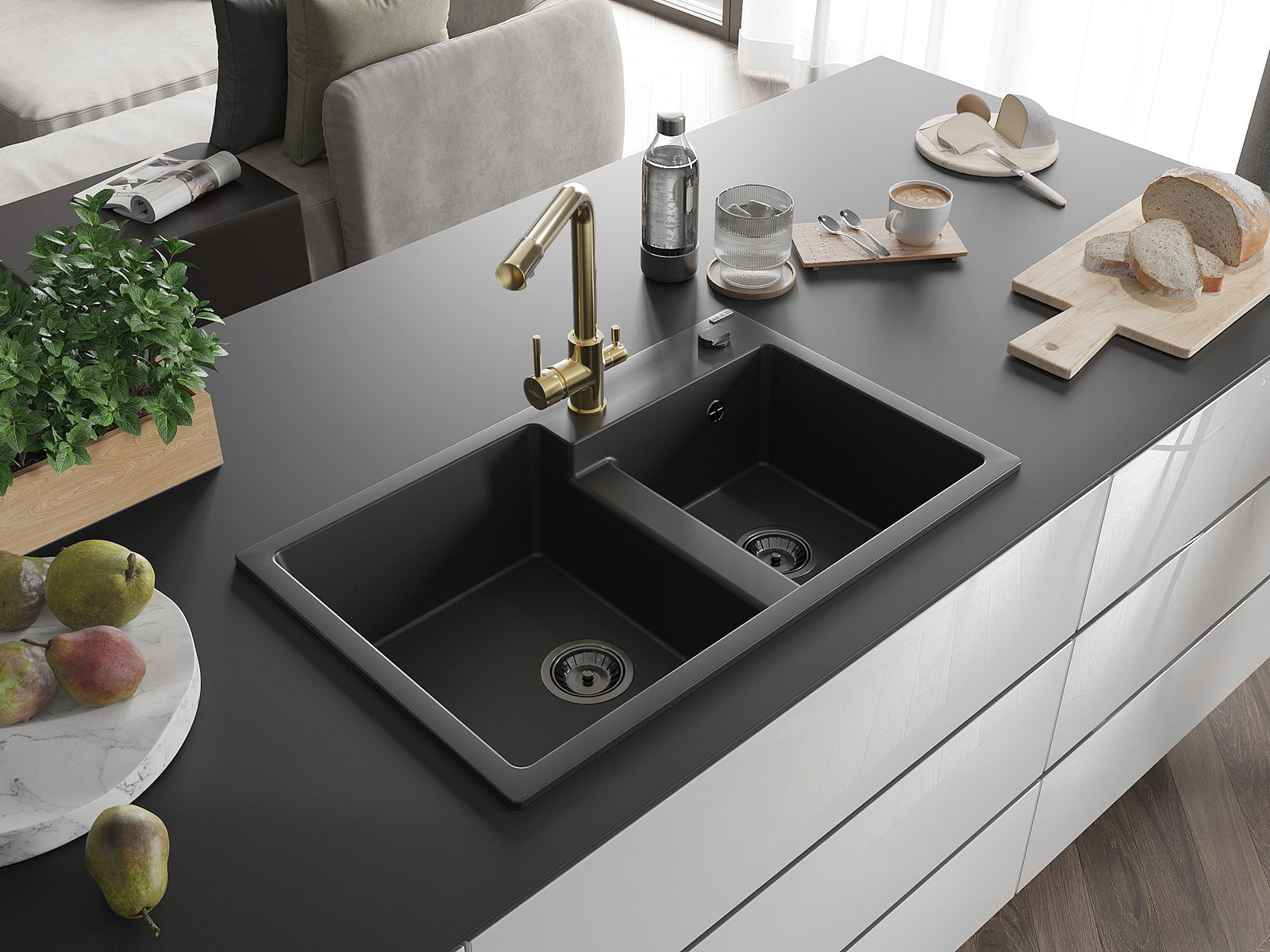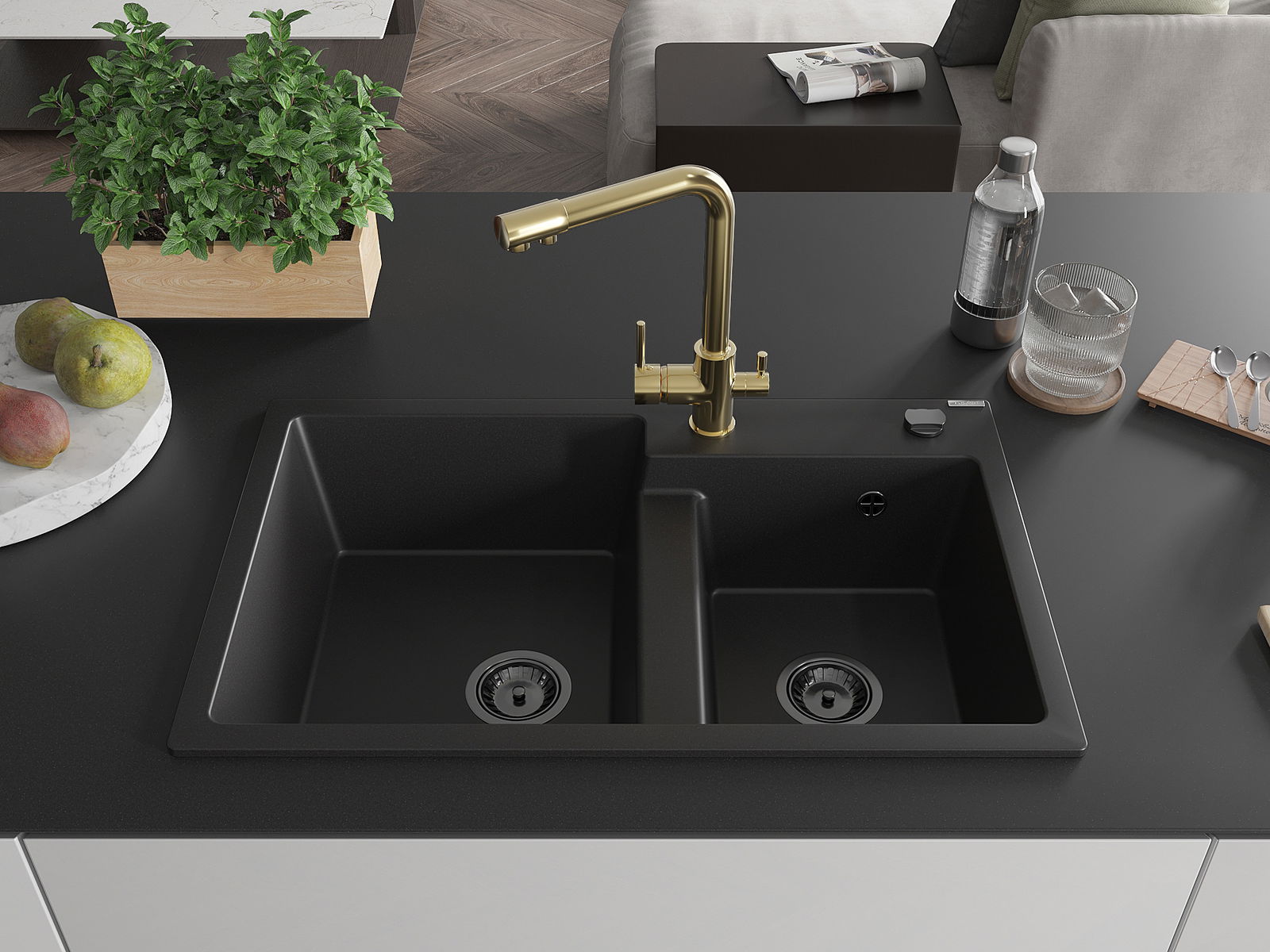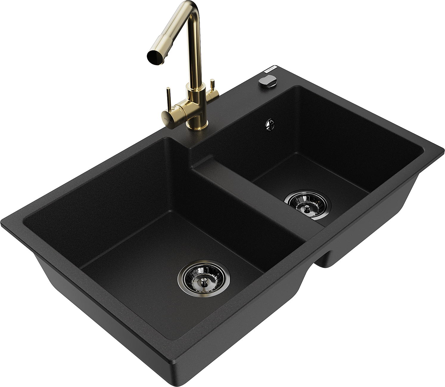Mexen Tomas granitinis dviejų skyrių plautuvės komplektas su virtuviniu maišytuvu Duero, juodas - 6516-77-671600-50-B