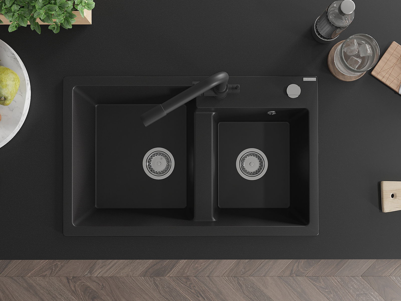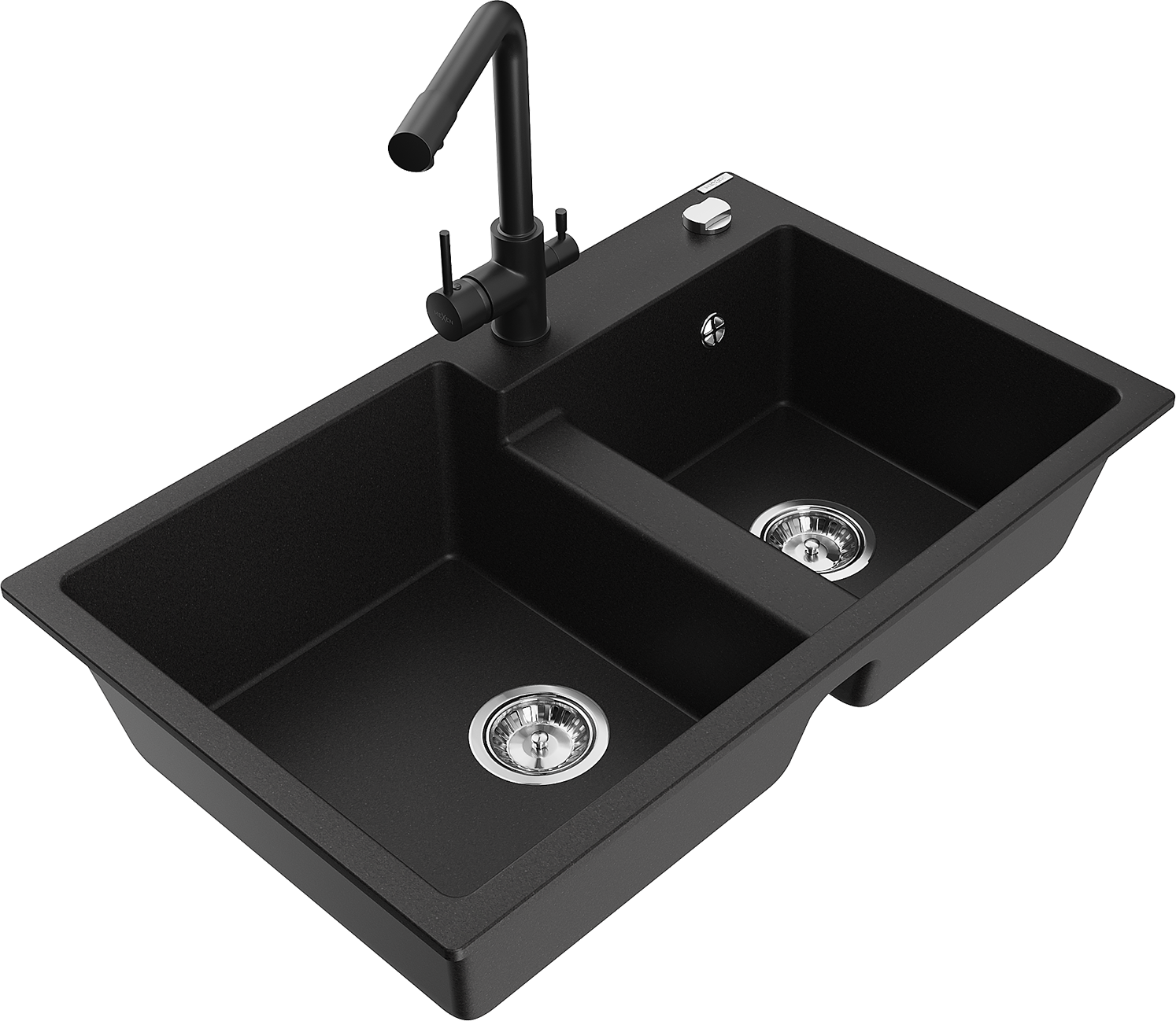 Mexen Tomas granitinis dviejų skylių plautuvas su virtuviniu čiaupu Duero, juodas - 6516-77-671600-70