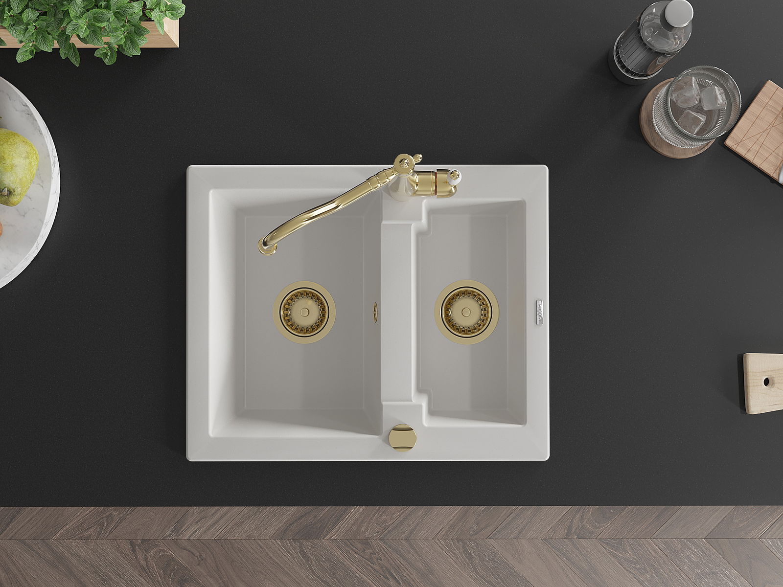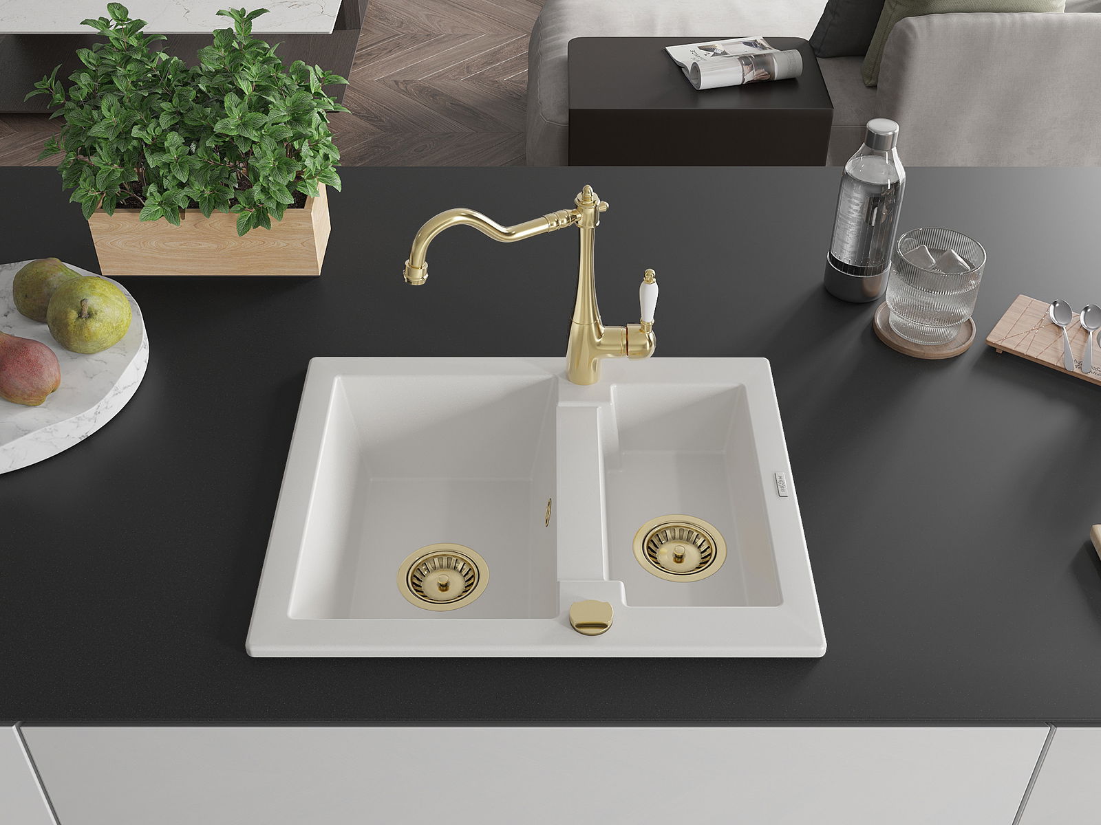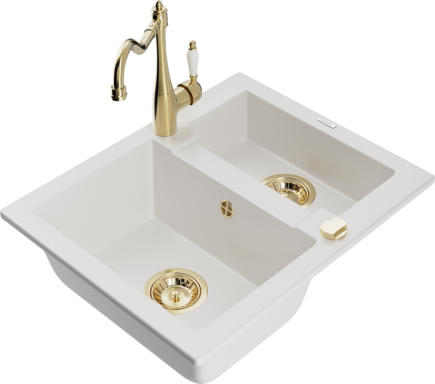 Mexen Carlos granito virtuvinė kriauklė 1,5 kameros su virtuviniu maišytuvu Carla, balta - 6518-20-670700-50
