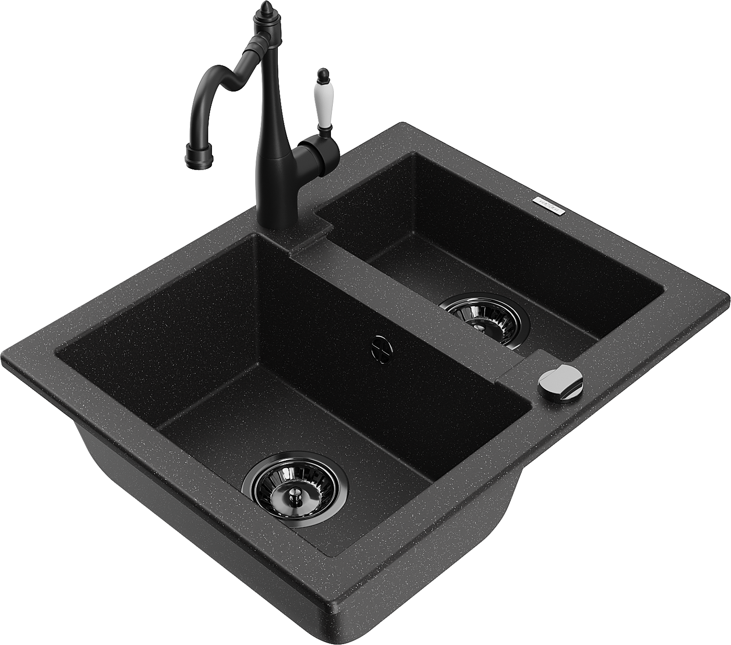Mexen Carlos granito kriauklė 1,5 skyrių su virtuviniu maišytuvu Carla, juodas/sidabrinis metalikas - 6518-73-670700-70-B
