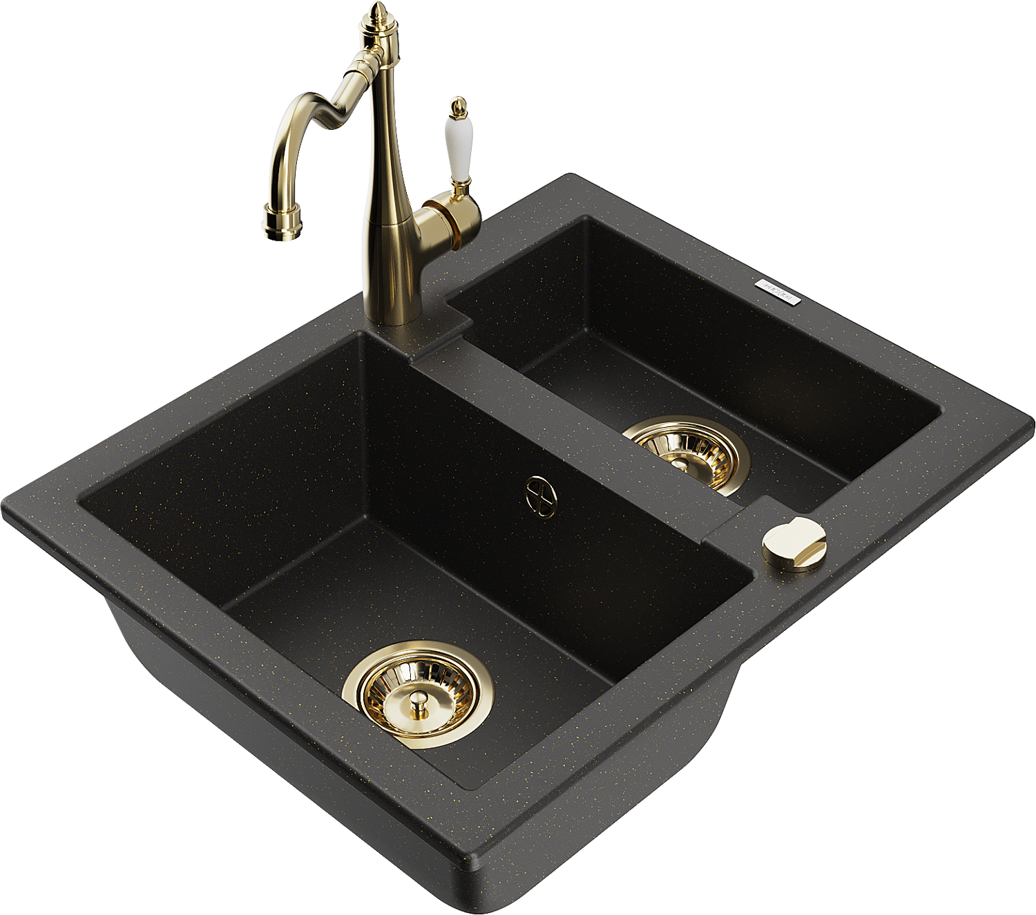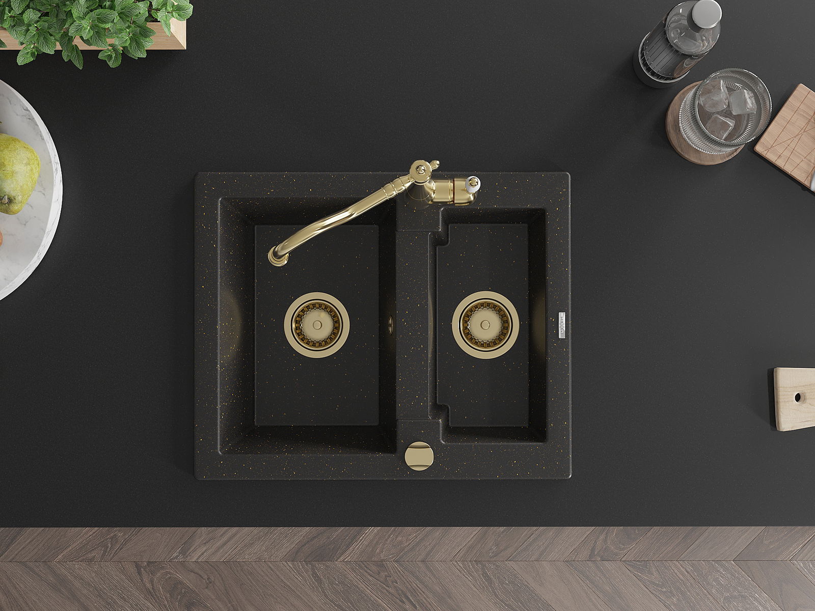 Mexen Carlos granitinis kriauklė 1,5 kamerų su virtuvės maišytuvu Carla, juoda/auksinė metalikas - 6518-75-670700-50