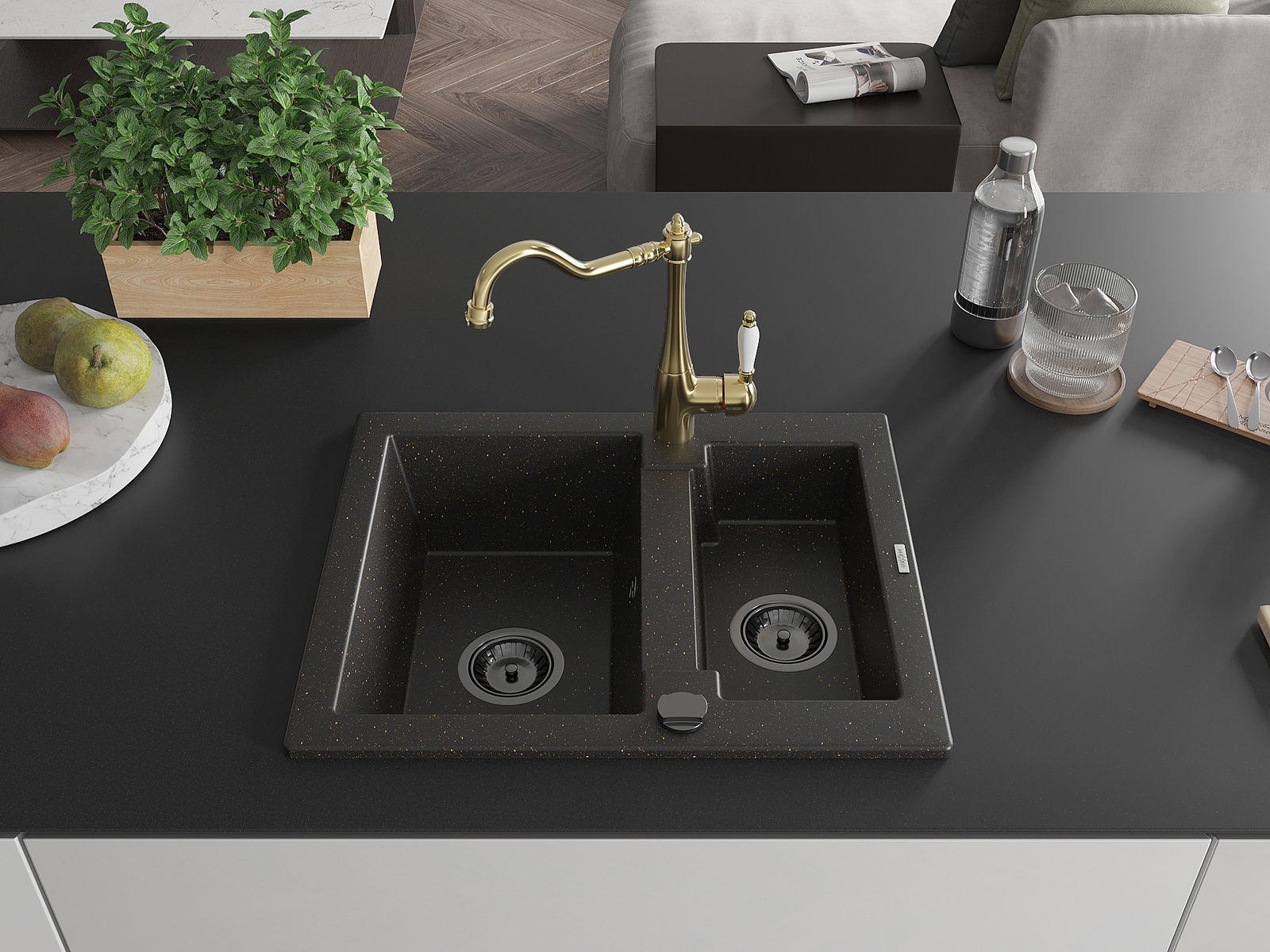 Mexen Carlos granito virtuvės plautuvė 1,5 kamerų su virtuviniu maišytuvu Carla, juodas/auksinis metalikas - 6518-75-670700-50-?