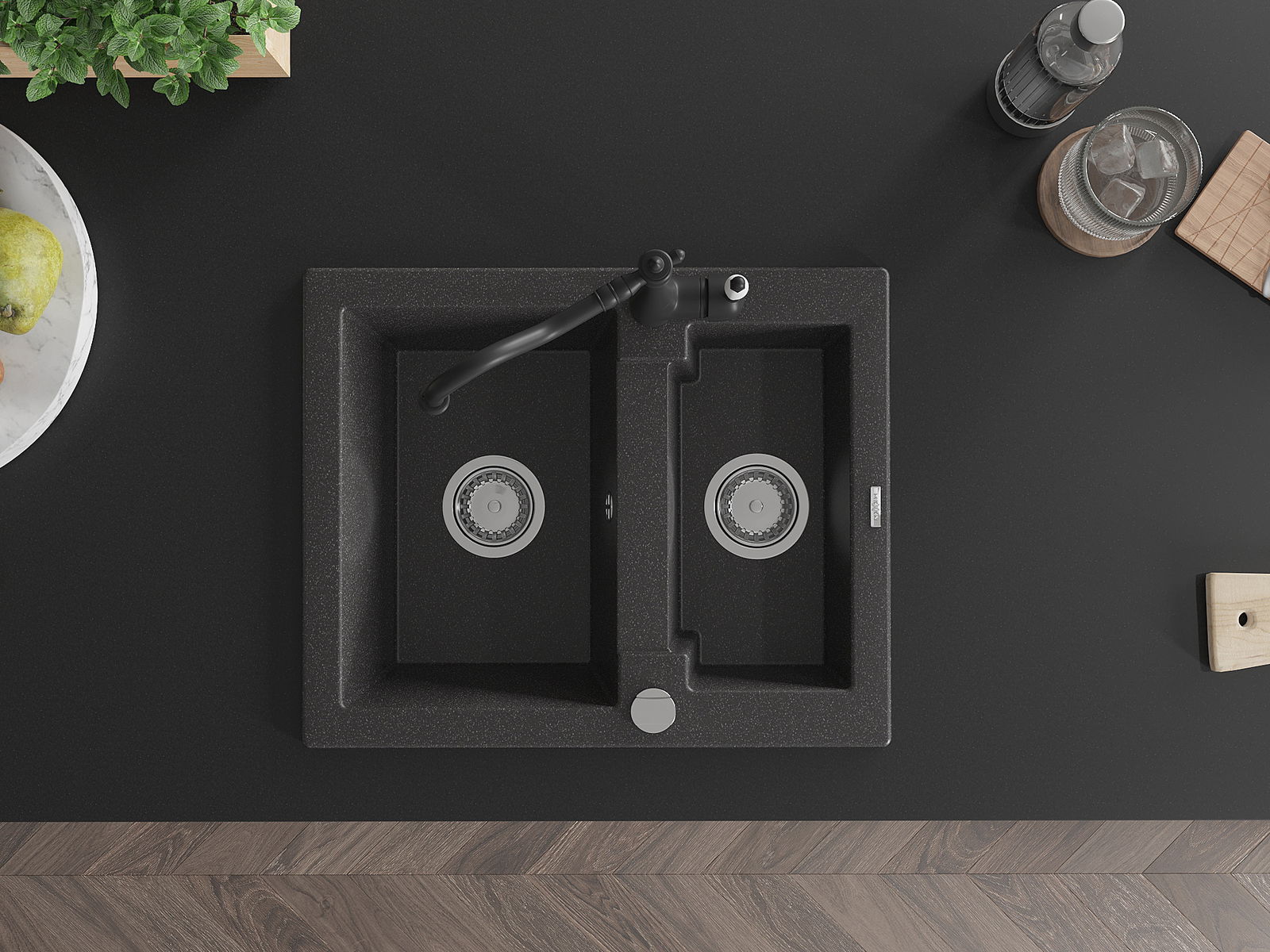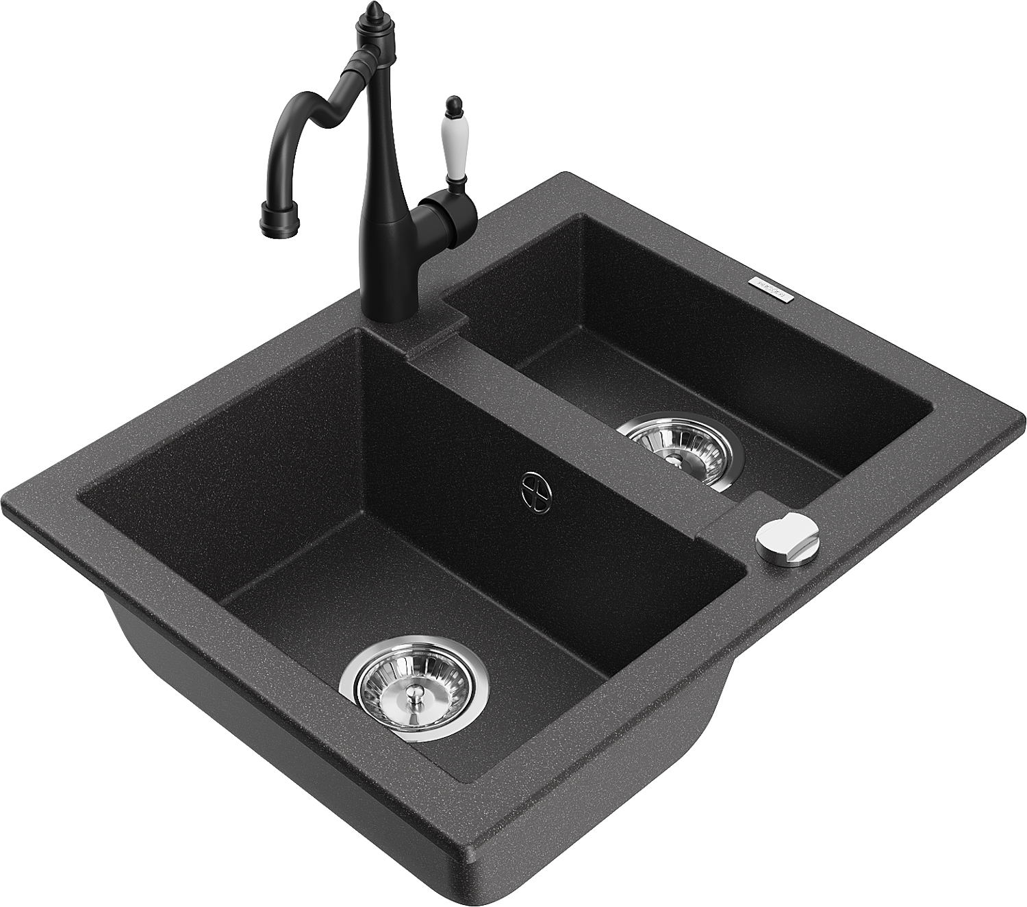 Mexen Carlos granitinis 1,5 kamerų virtuvinis kriauklė su virtuviniu maišytuvu Carla, juodas dėmėtas - 6518-76-670700-70
