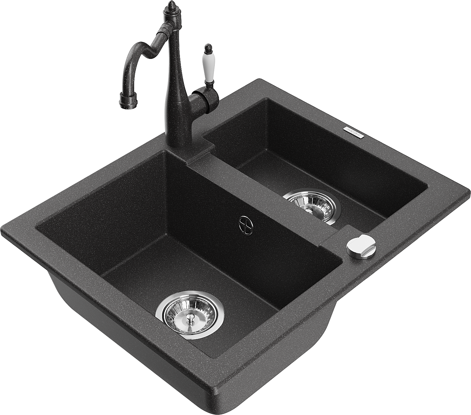 Mexen Carlos granitinė 1,5 kamerų virtuvės kriauklė su maišytuvu Carla, juodas dėmėtas - 6518-76-670700-76