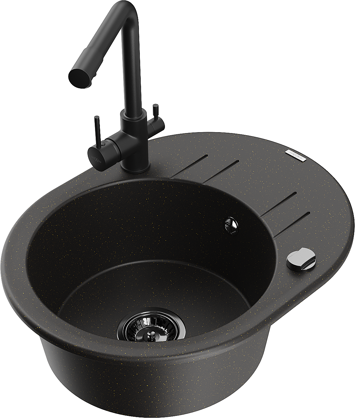 Mexen Kevin vienos kvadrato plautuvė iš granito su nusausėjimo zona ir virtuvės maišytuvu Duero, juoda/auksinė metalika