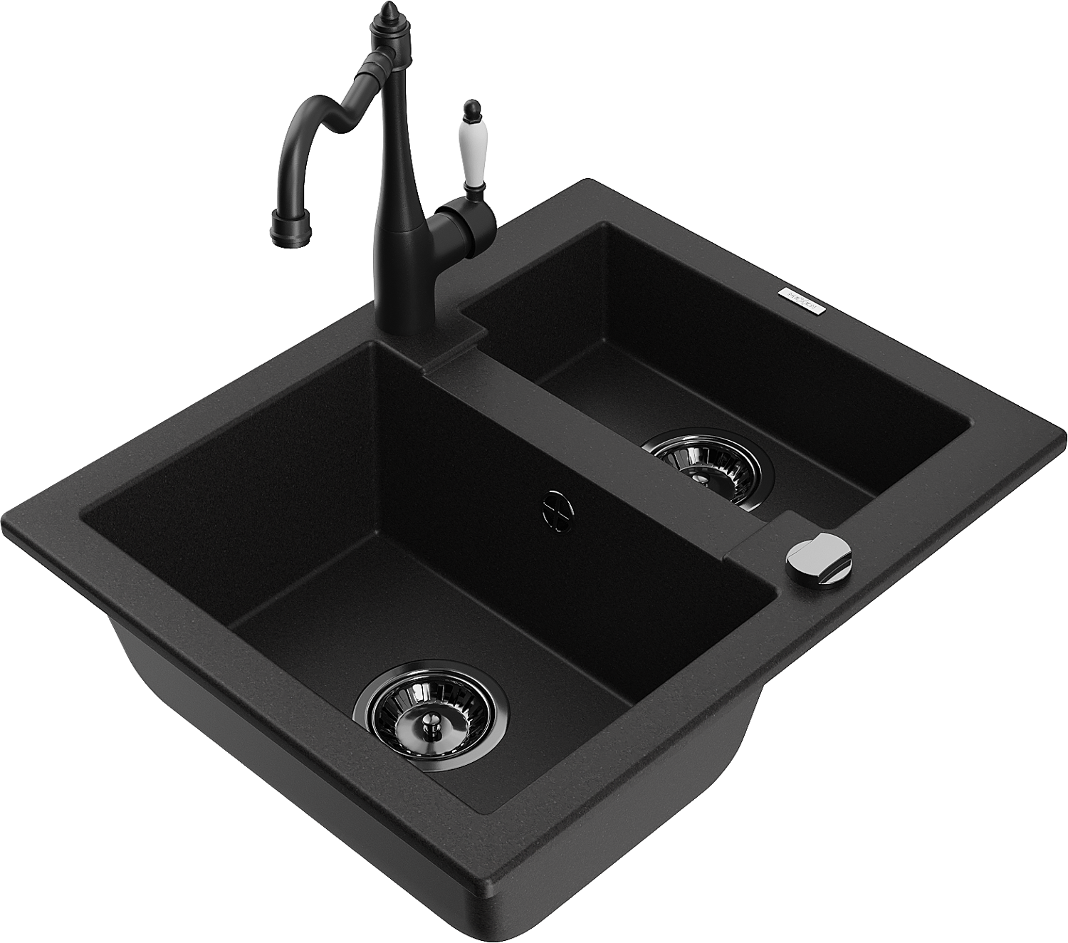 Mexen Carlos granitinė kriauklė su 1,5 skyrelio ir virtuvės maišytuvu Carla, juoda - 6518-77-670700-70-B
