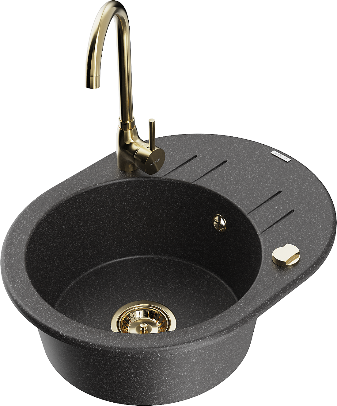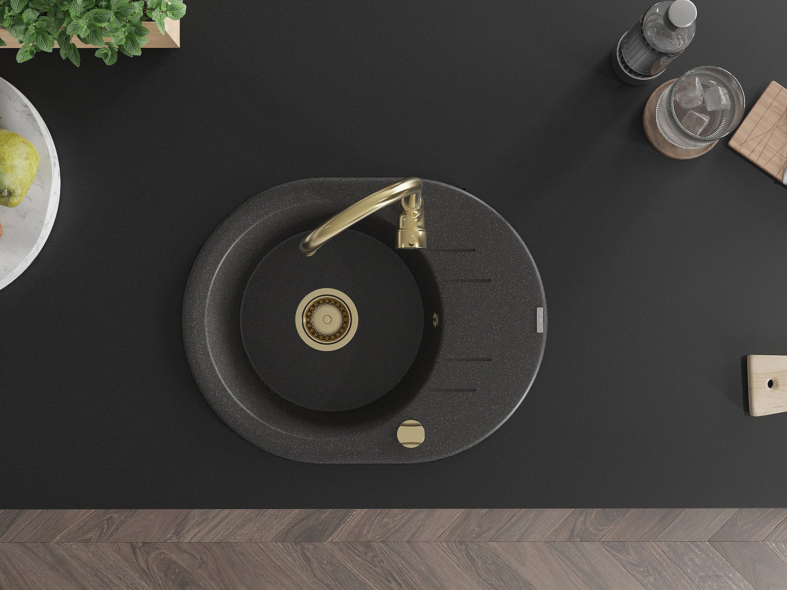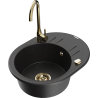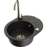 Mexen Kevin granitinė plautuvė su viena kamera, nutekamuoju plotu ir Telma virtuviniu maišytuvu, juoda su taškeliais