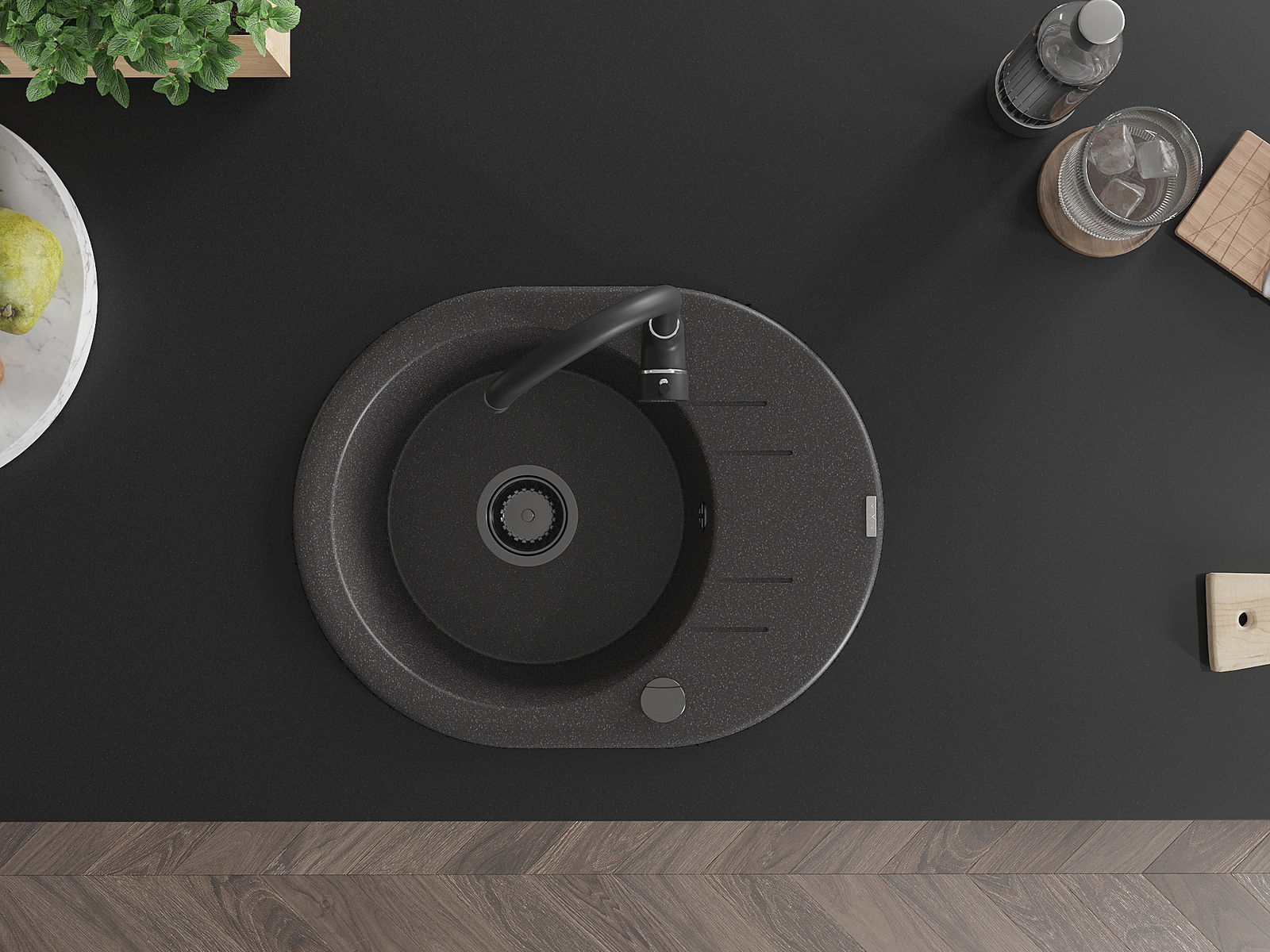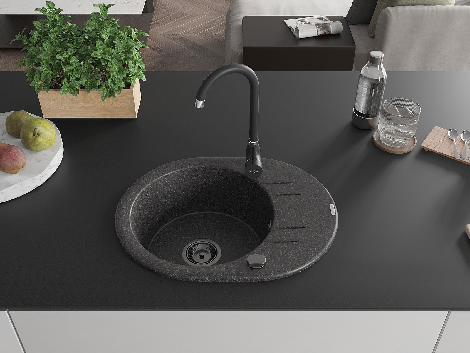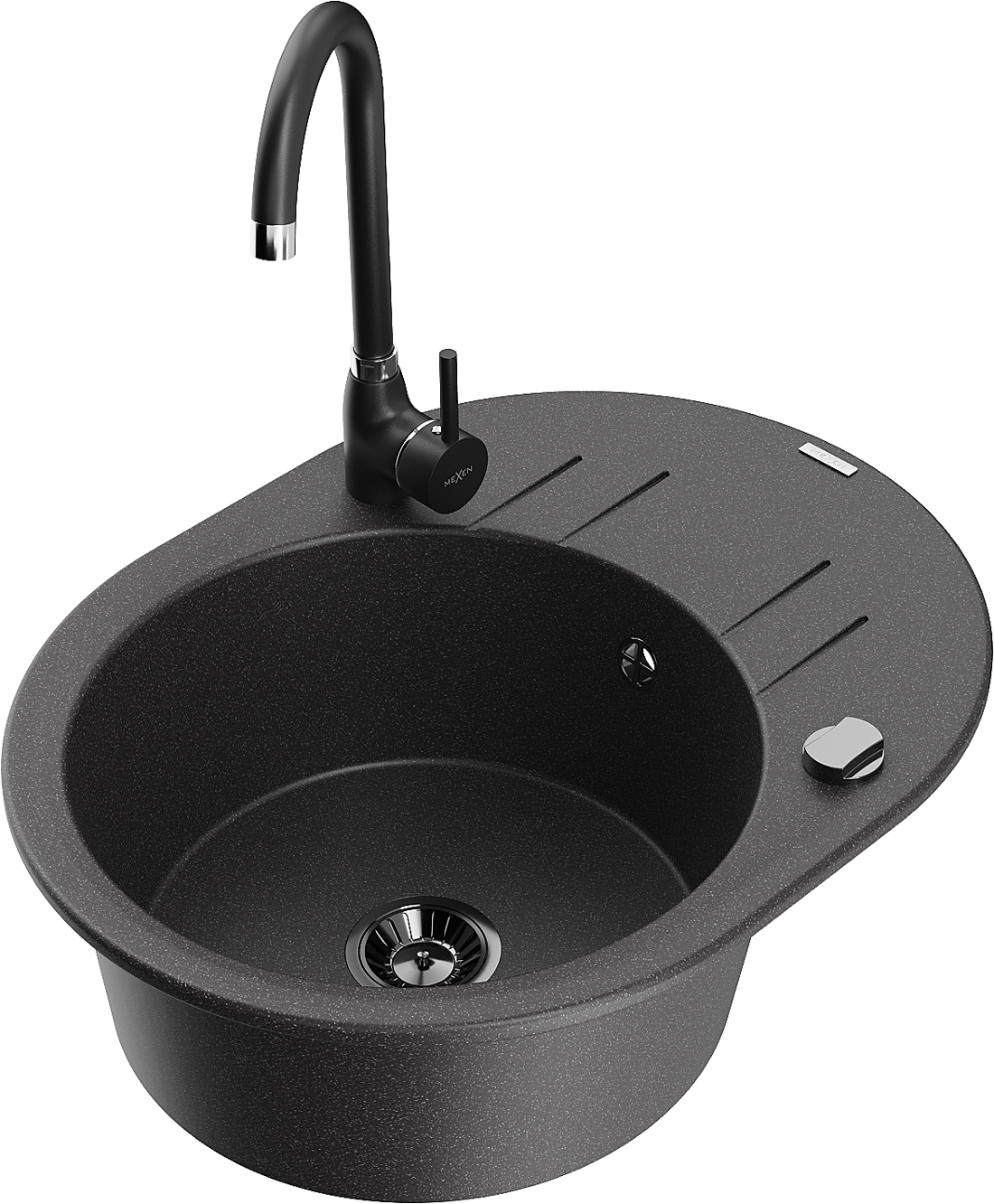 Mexen Kevin granitinė 1 kameros plautuvė su nusausinimo lentyna ir virtuves čiaupu Telma, juoda su dėmėmis