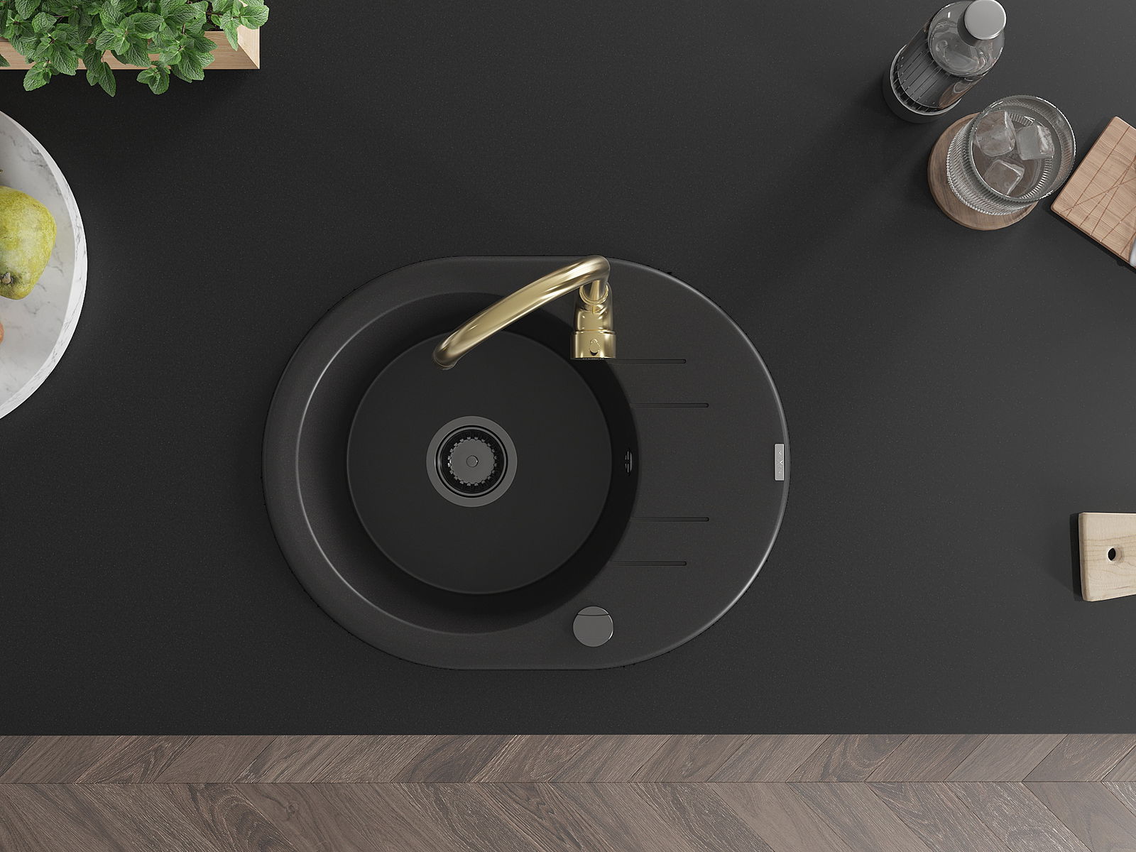 Kriauklė turi 2 iš anksto frezuotas skyles, kurių skersmuo yra 35 mm, skirtas savarankiškam išmušimui. Jas galima naudoti, pavyzdžiui, skysčio dozatoriaus montavimui, kuris pašalins plastikinių butelių buvimą virtuvėje ir suteiks jai elegantišką apdailą.