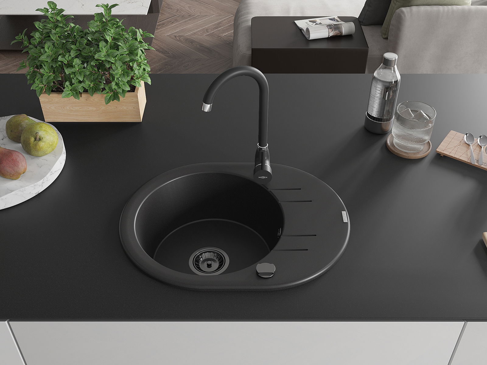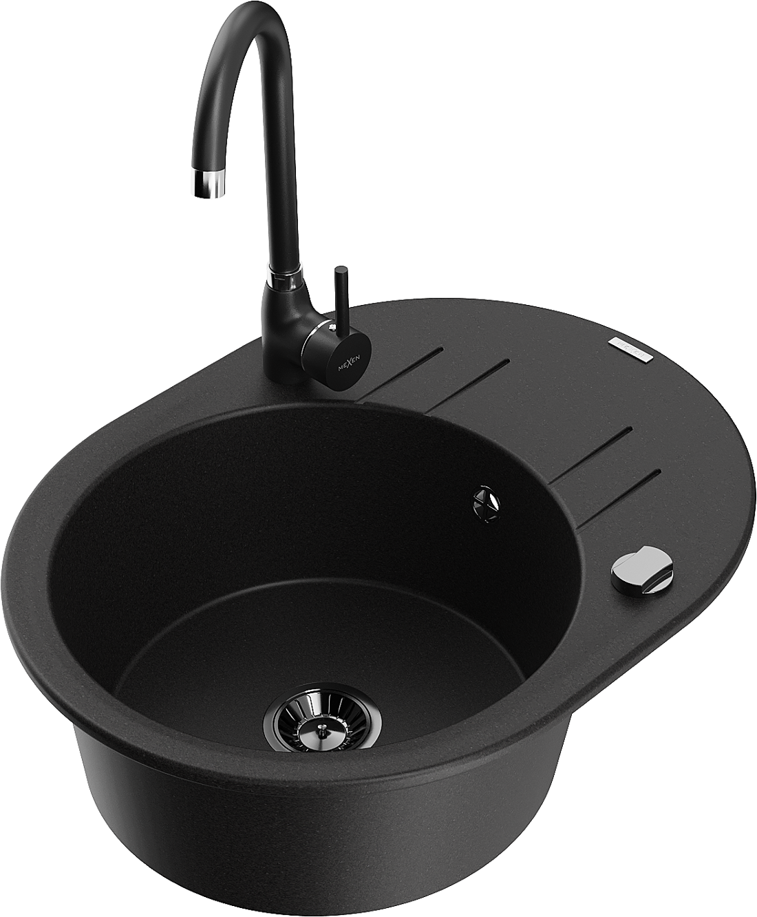 Mexen Kevin vienos kameros granitinė plautuvė su nutekamuoju ir virtuviniu maišytuvu Telma, juoda - 6517-77-670200-70-B