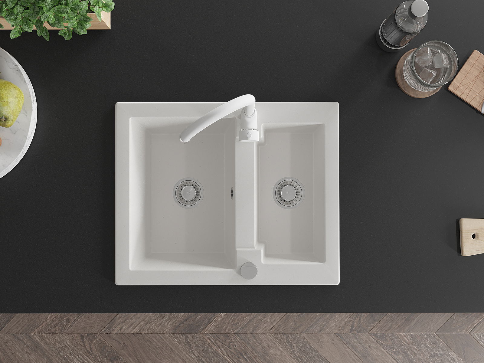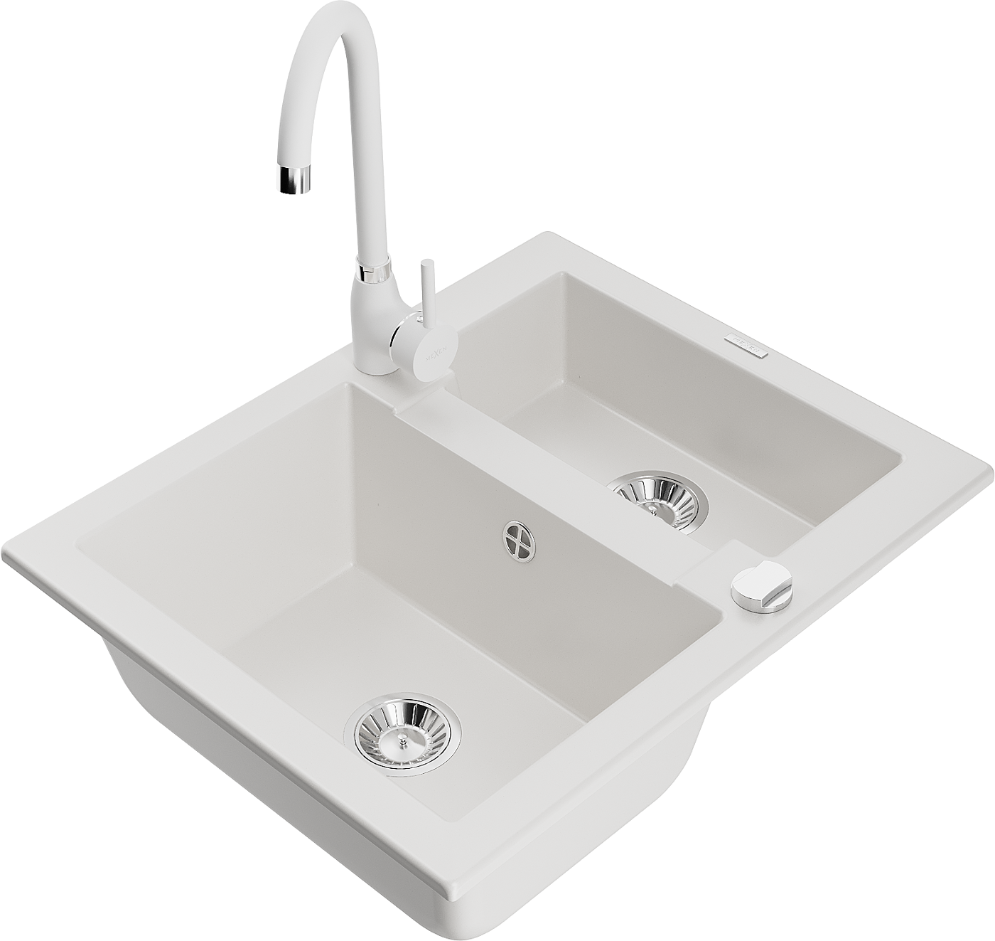 Mexen Carlos granitinė virtuvės kriauklė 1,5 sekcijų su virtuviniu maišytuvu Telma, balta - 6518-20-670200-20