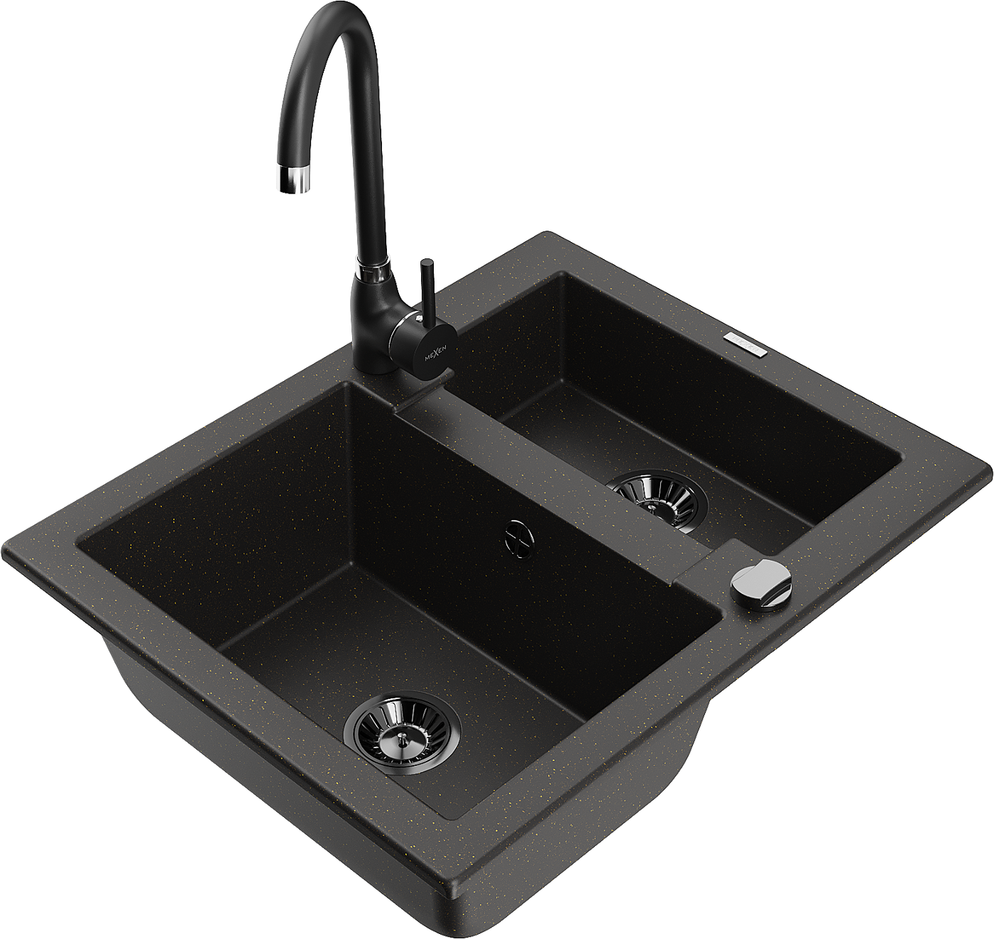 Mexen Carlos granitinis kriauklė 1,5 kameros su virtuviniu maišytuvu Telma, juoda/auksinis metalikas - 6518-75-670200-70-B