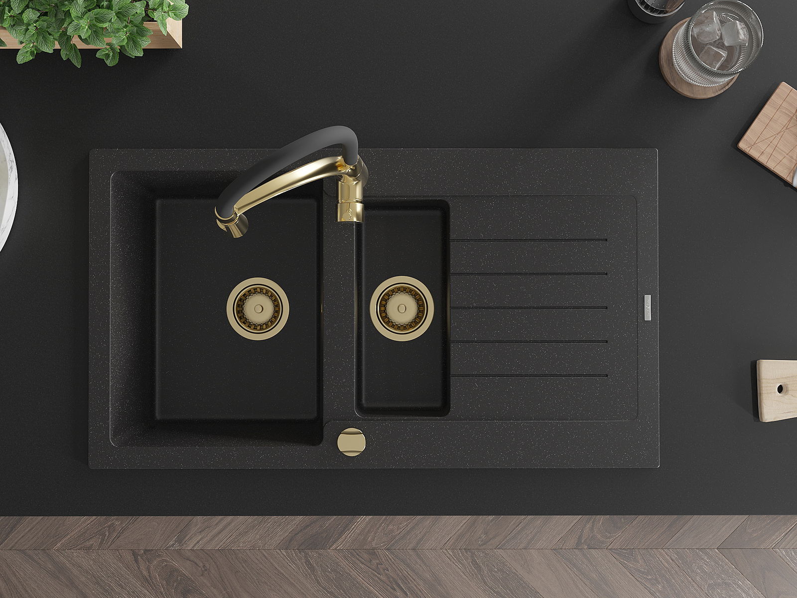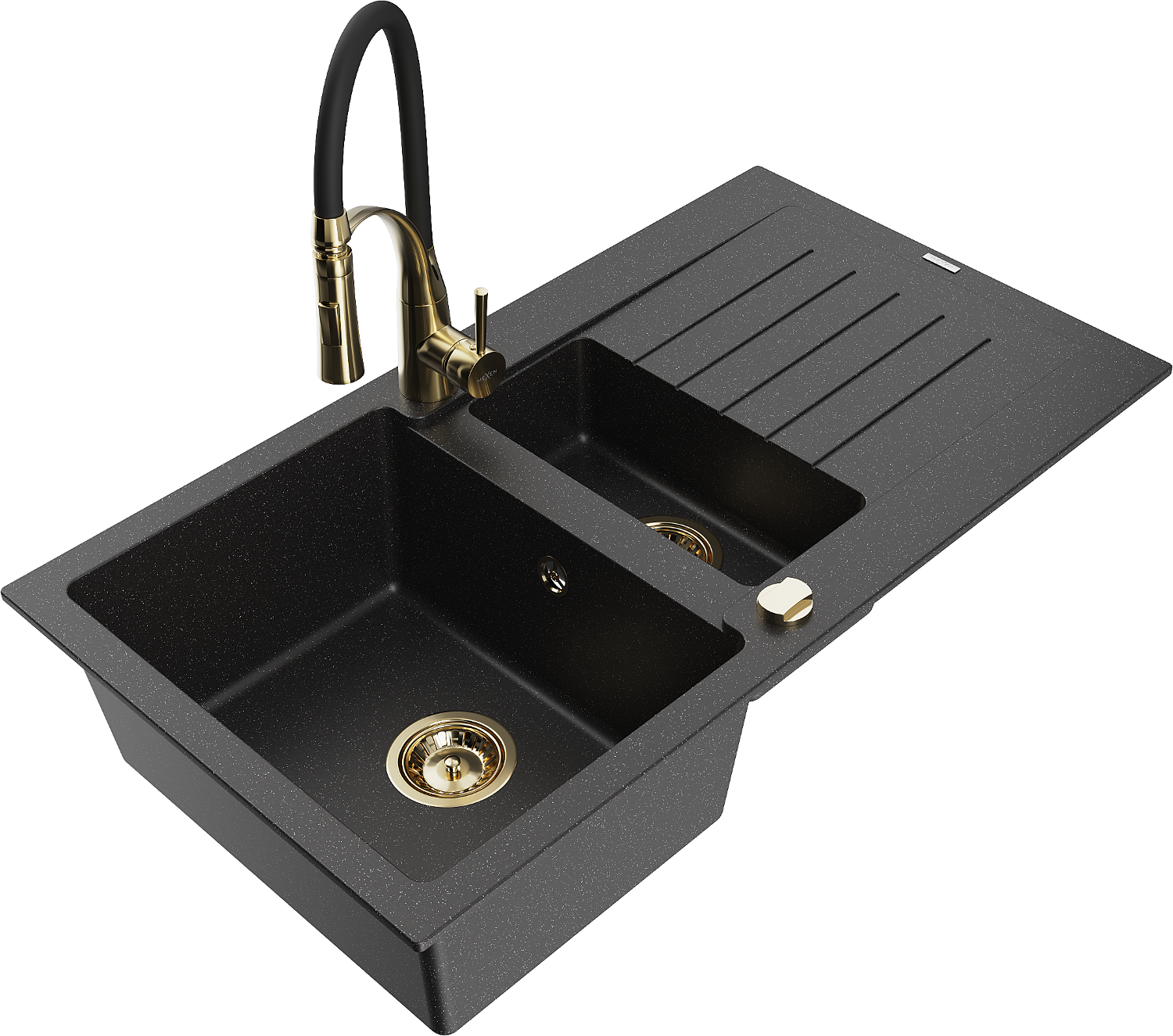Mexen Matias granitinė 1,5 kamerų kriauklė su nusausinimo vieta ir virtuviniu maišytuvu Aster, juoda/sidabrinė