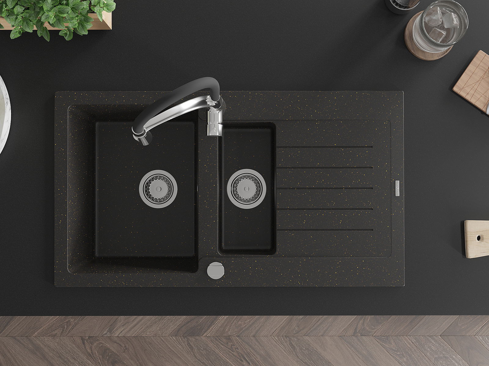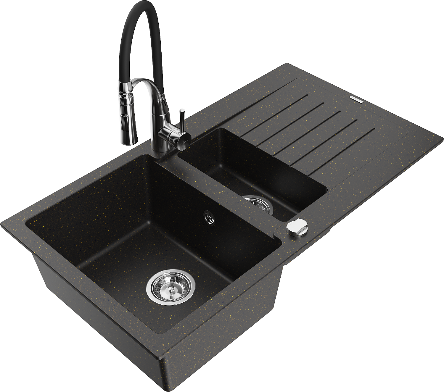 Mexen Matias granitinė 1,5 kamerų plautuvė su nusausinkite ir virtuviniu maišytuvu Aster, juoda/auksinė metalo