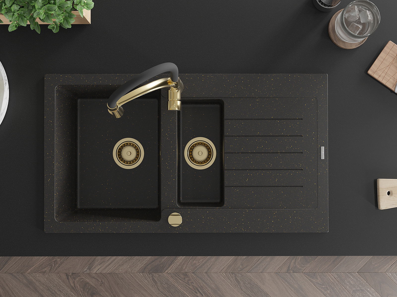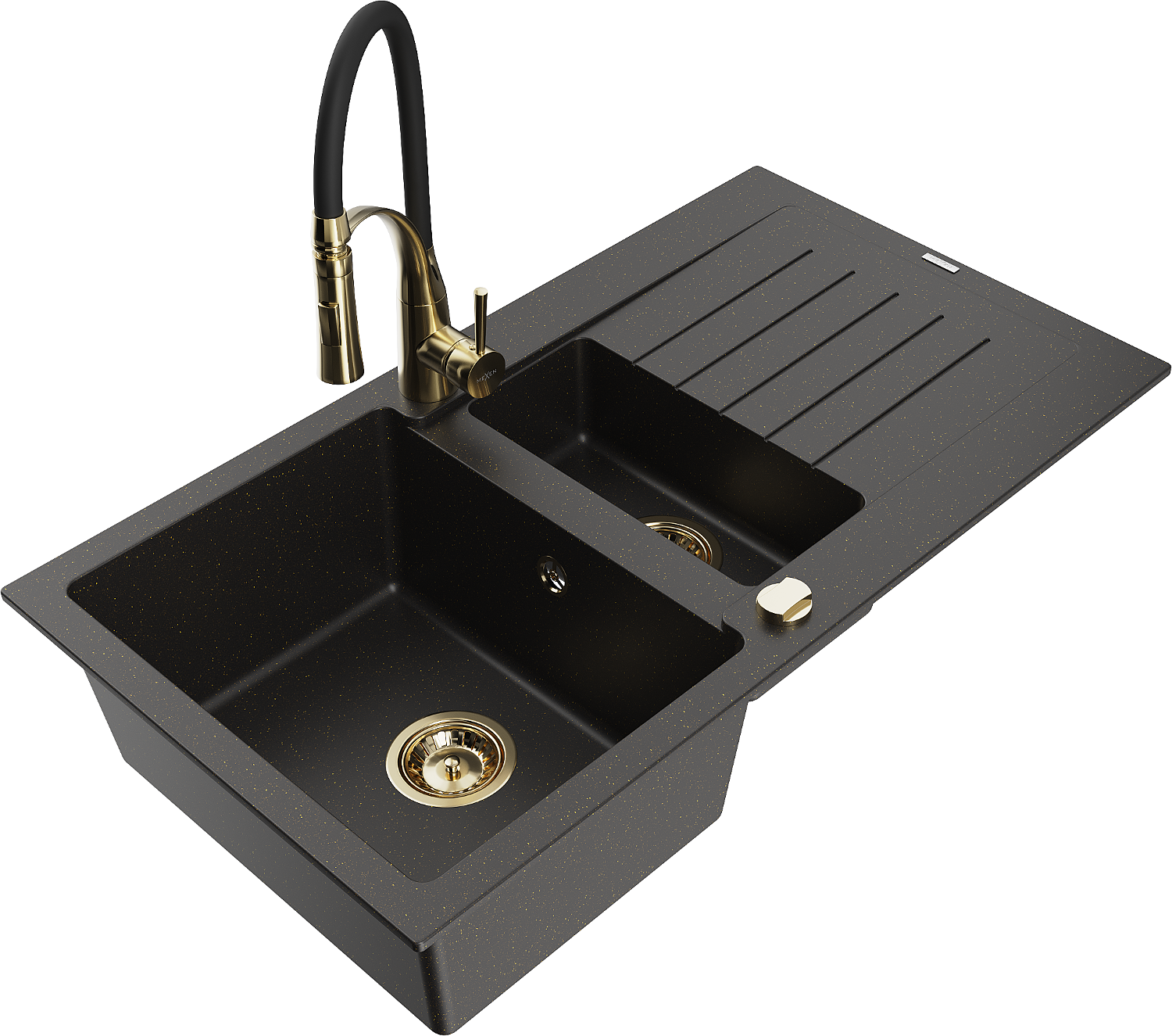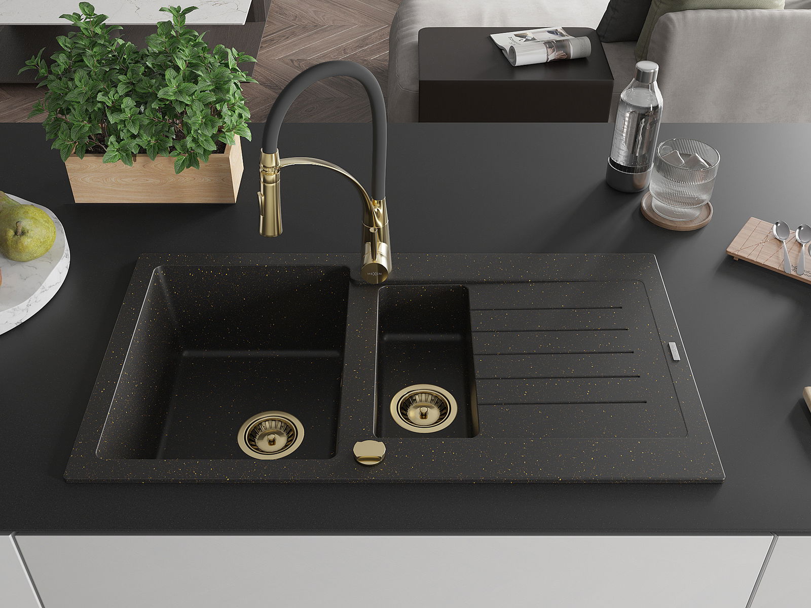 Mexen Matias granitinė 1,5 sekcijų plautuvė su nusausintuvu ir virtuvės čiaupu Aster, juoda/auksinis metalikas