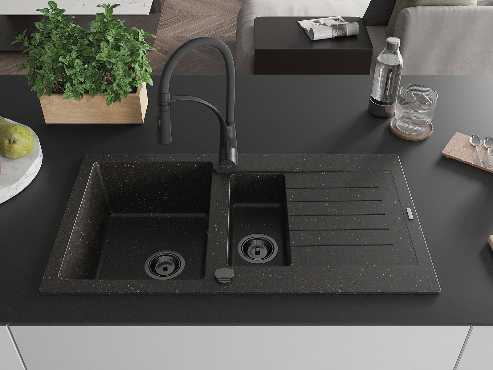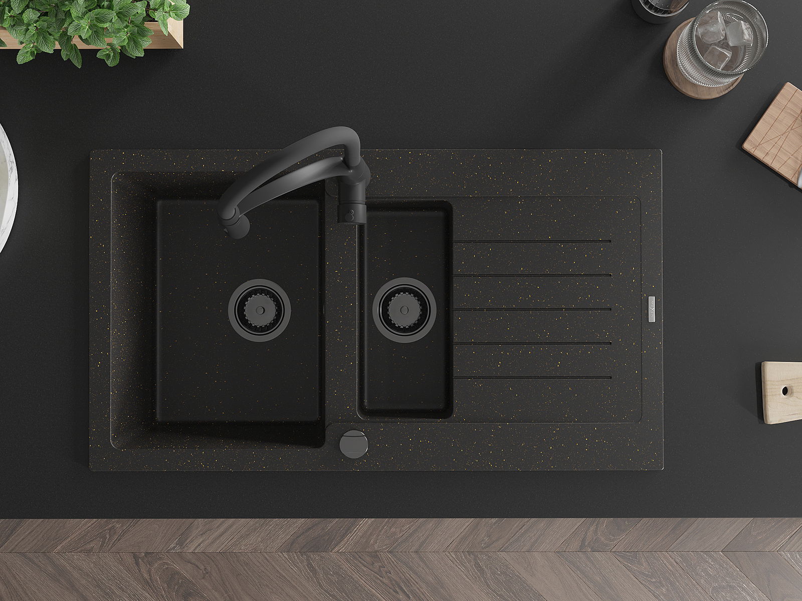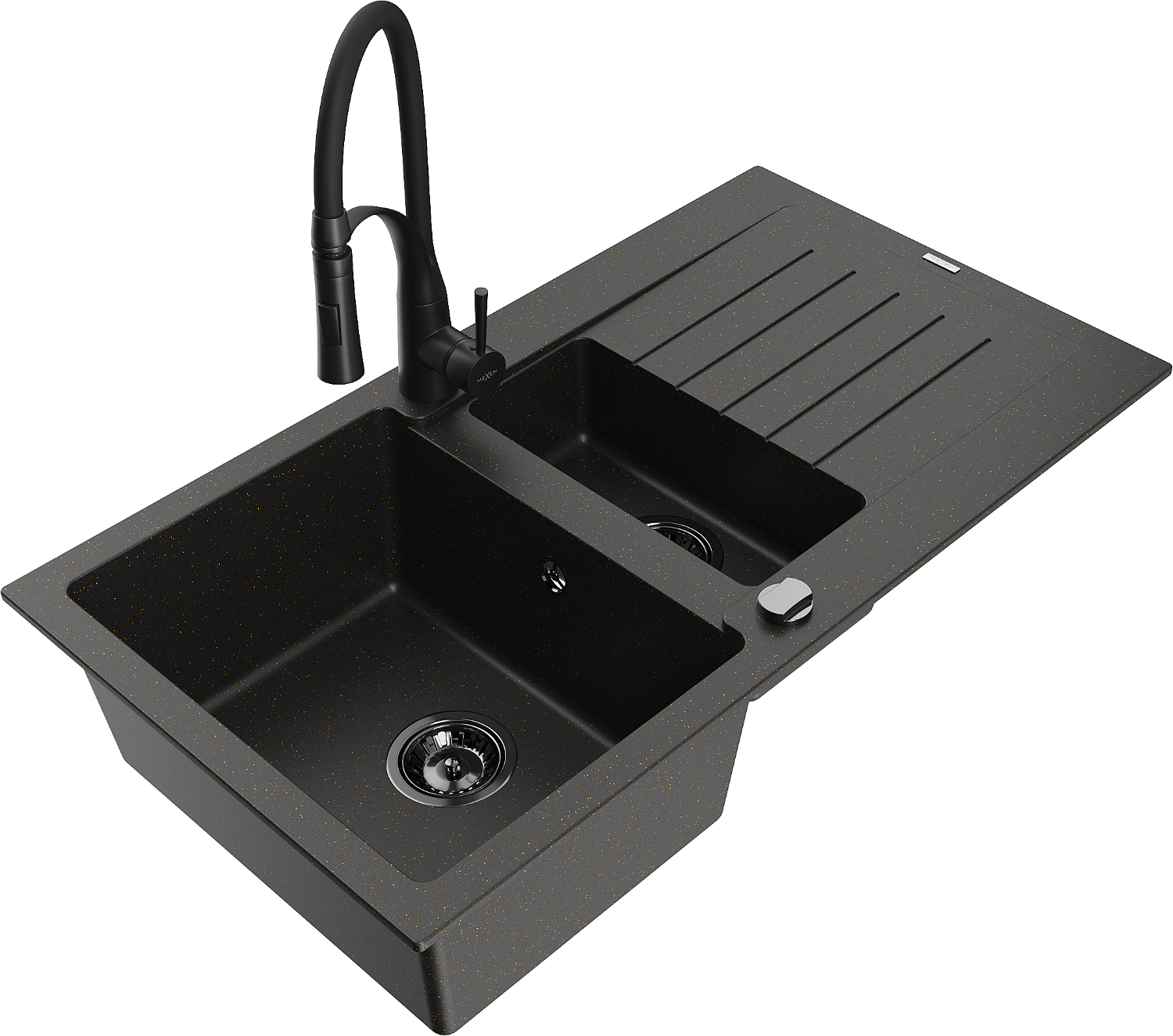 Mexen Matias granitinė 1,5 kamerų plautuvė su nuvarvėtu ir virtuviniu maišytuvu „Aster“, juoda/auksinis metalikas