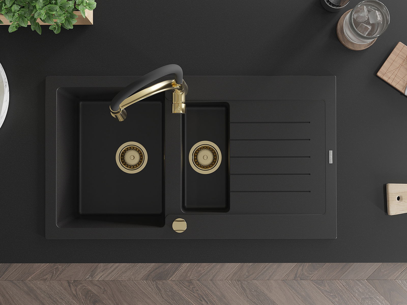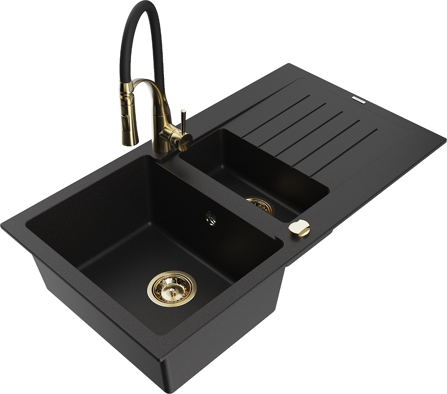 Mexen Matias granito plautuvas 1,5 kamerų su nusausintuvu ir virtuviniu maišytuvu Aster, juodas - 6502-77-73450-57-G