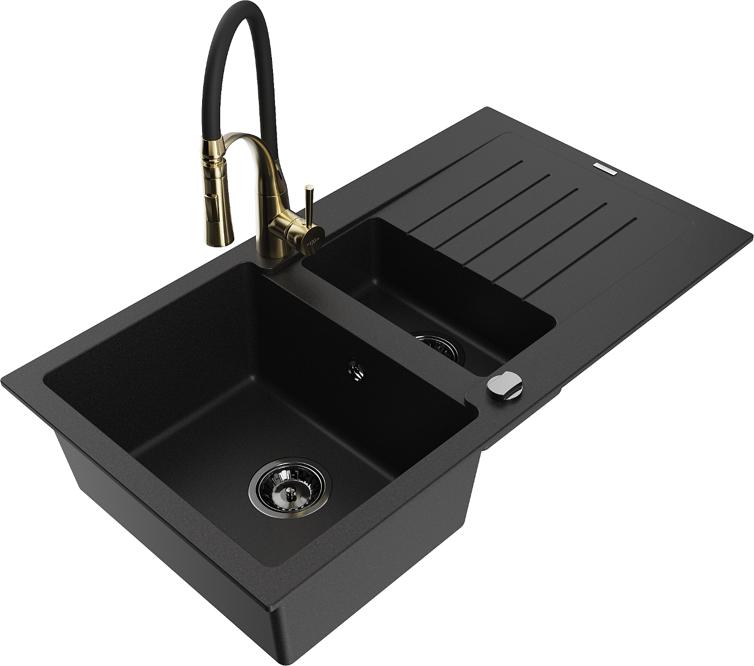 Mexen Matias 1,5 talpos granitinė plautuvė su indaplove ir virtuvės maišytuvu Aster, juodas - 6502-77-73450-57-B