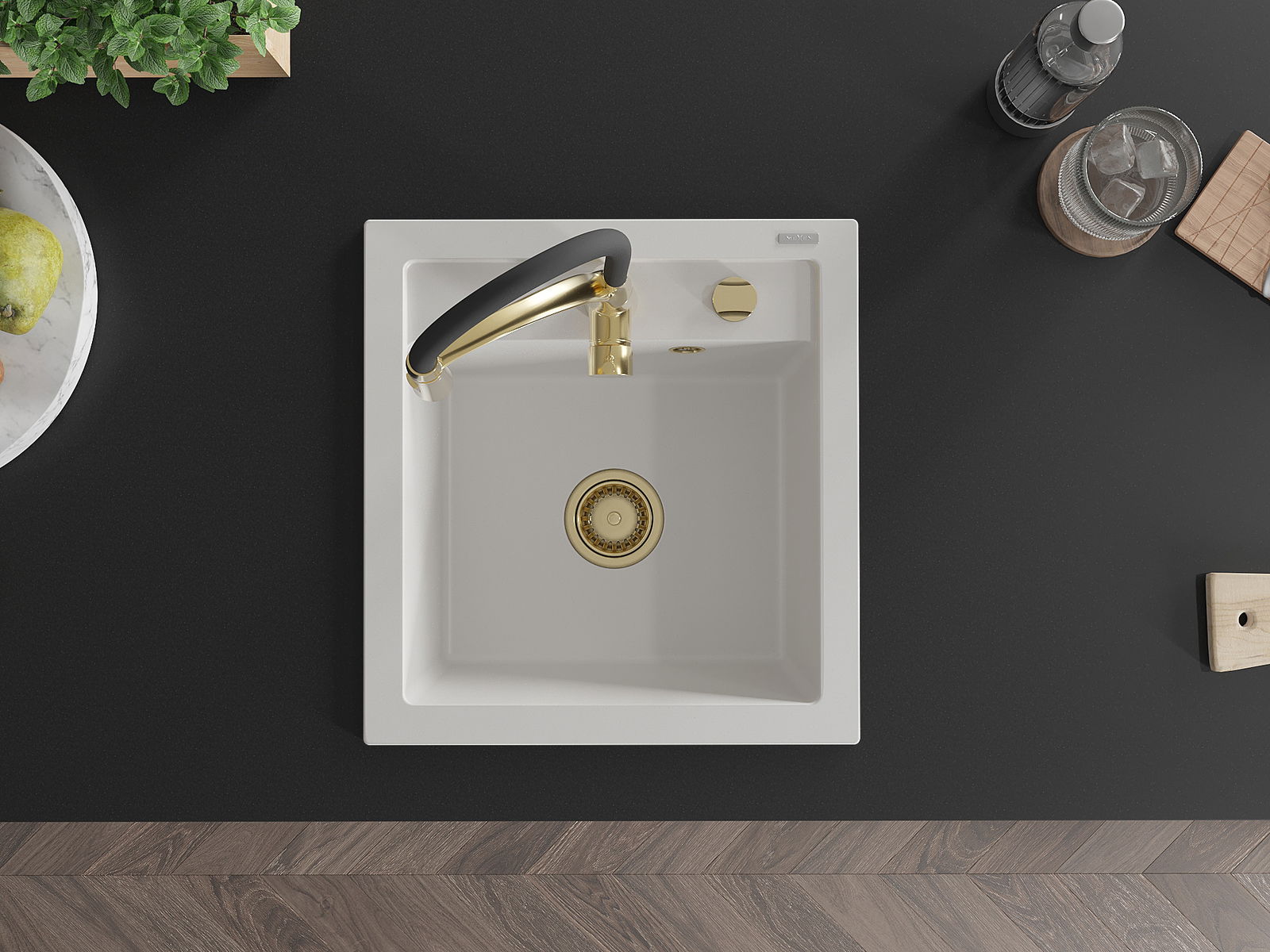 Mexen Vito granitinis virtuvės kriauklė su 1 kamera ir virtuviniu maišytuvu Aster, baltas - 6503-20-73450-57-G