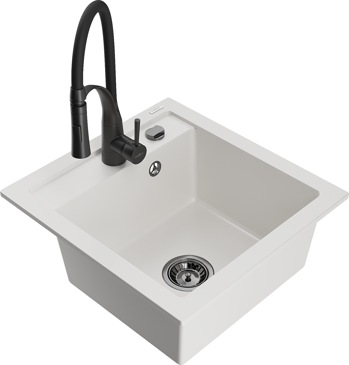 Mexen Vito granito virtuvės kriauklė su viena dubeniu ir virtuvės maišytuvu Aster, balta - 6503-20-73450-70-B