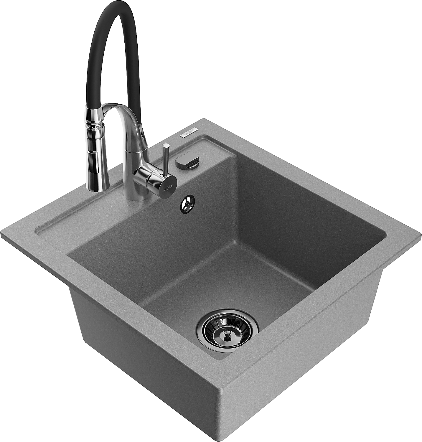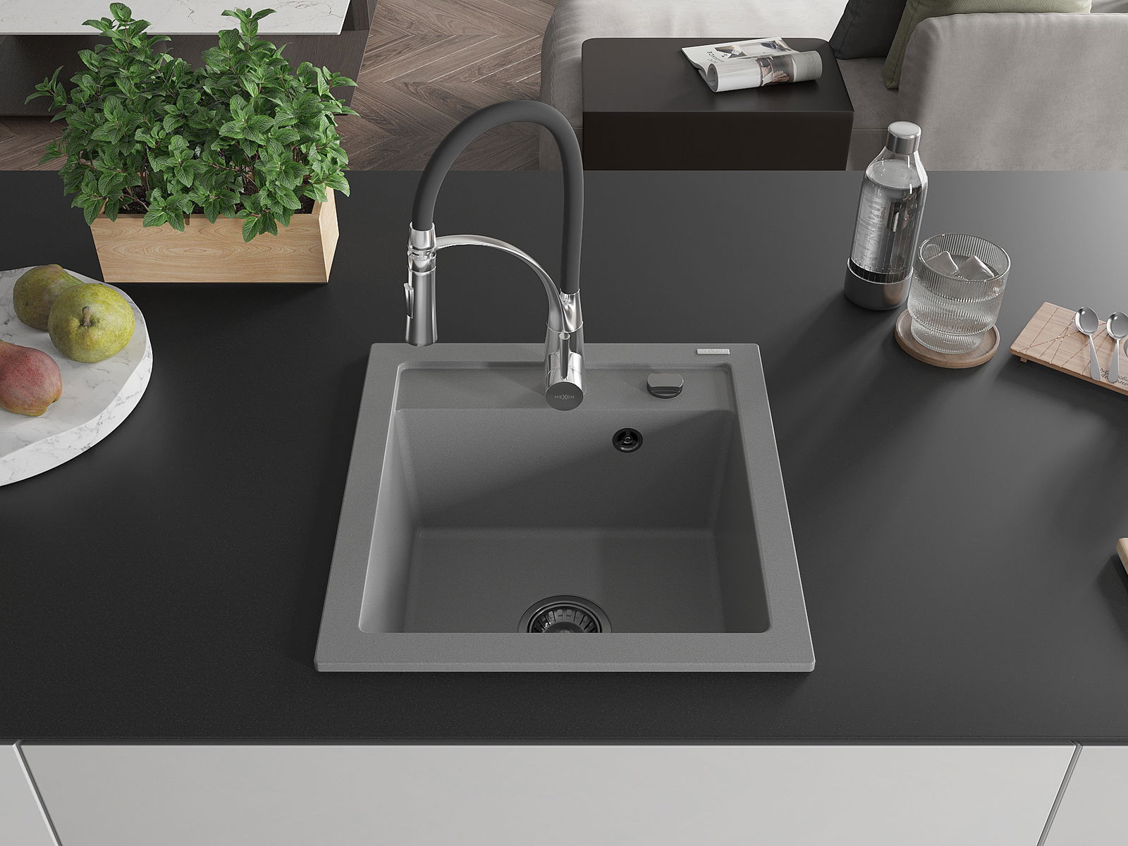 Mexen Vito granitinis vienos kameros virtuvės kriauklė su virtuviniu maišytuvu Aster, pilka - 6503-71-73450-07-B
