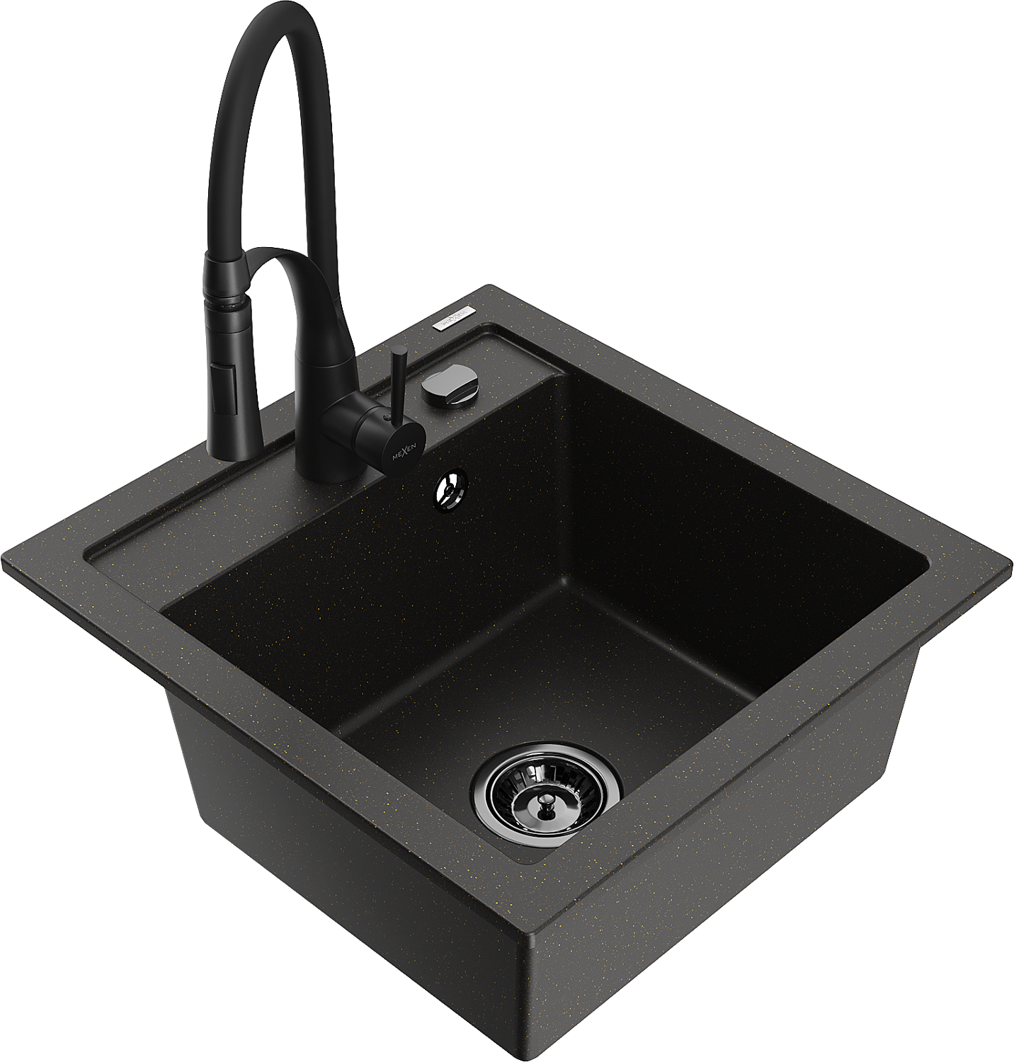 Mexen Vito granitinė vienos kameros plautuvė su virtuviniu maišytuvu Aster, juoda/auksinio metalo - 6503-75-73450-70-B