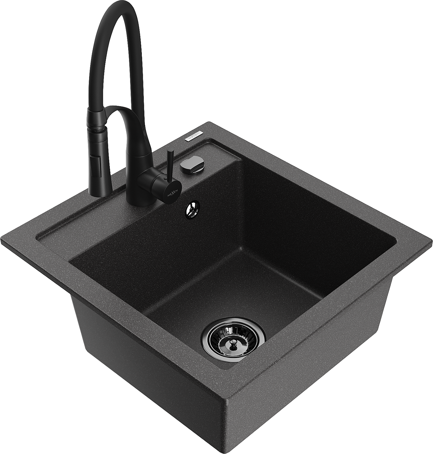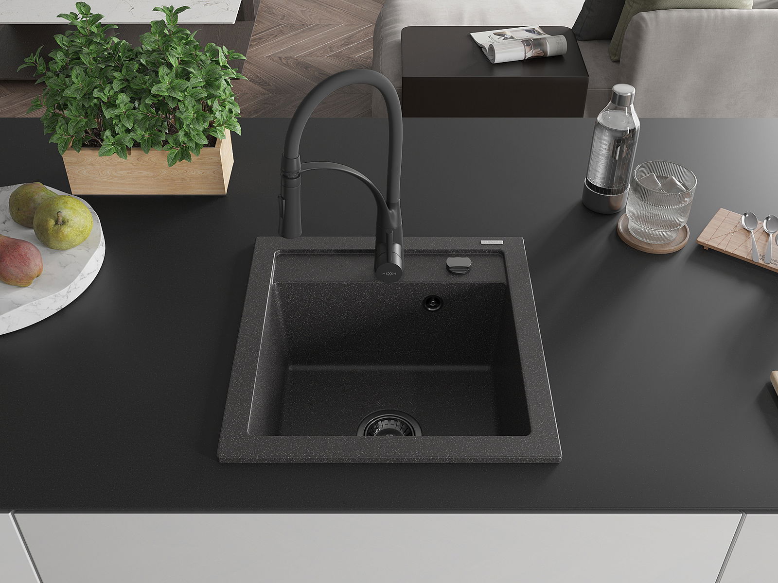 Mexen Vito granitinis vienos kameros plautuvė su virtuviniu maišytuvu Aster, juodas dėmėtas - 6503-76-73450-70-B