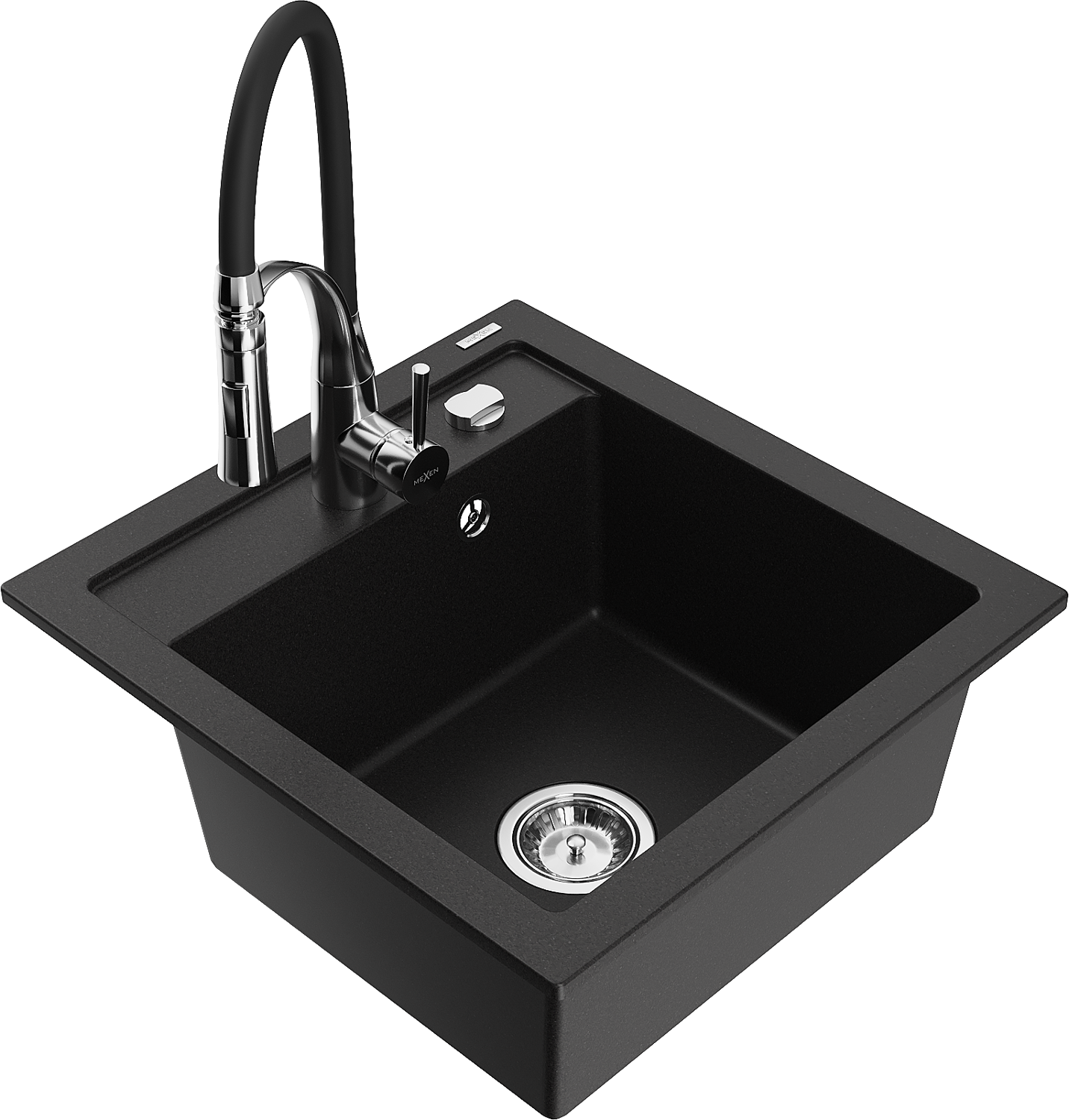 Mexen Vito granitinė vienos kameros kriauklė su virtuviniu maišytuvu Aster, juoda - 6503-77-73450-07