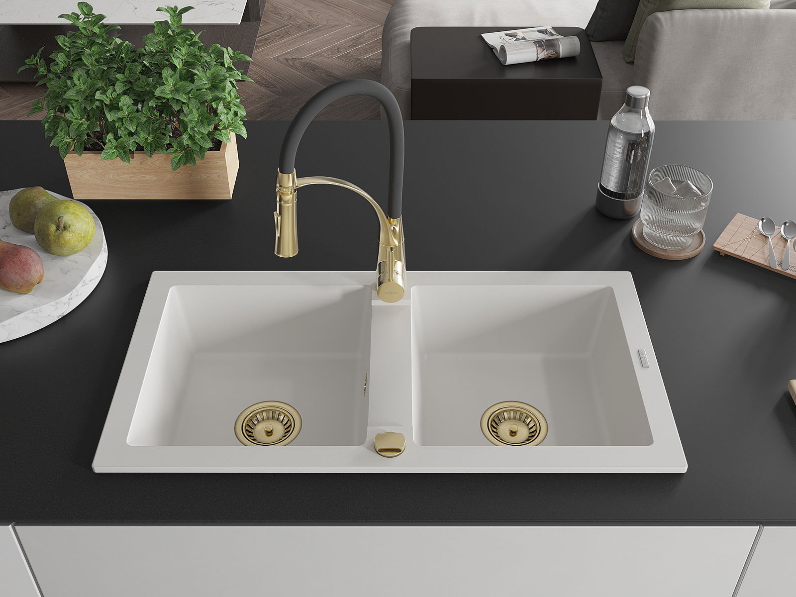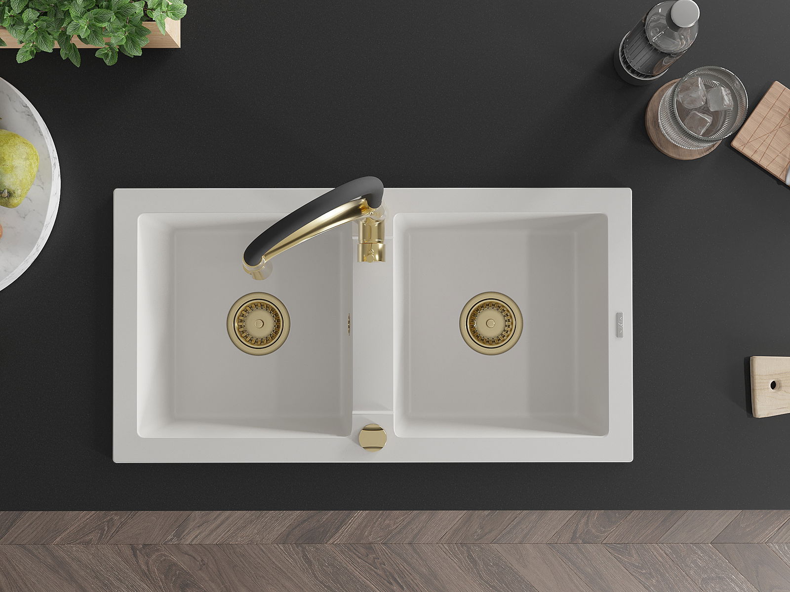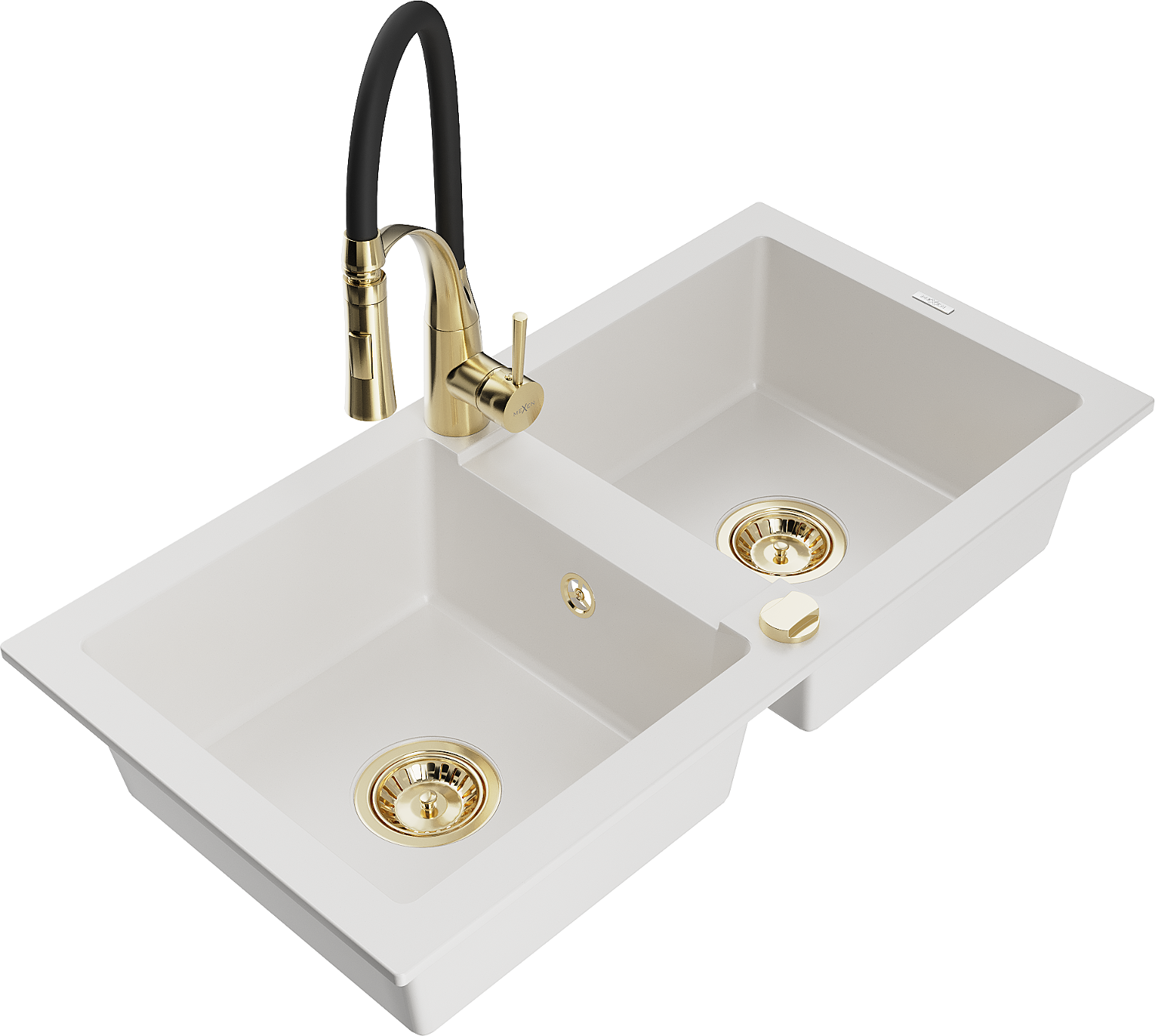 Mexen Mario granitinis dviejų skyrių plautuvė su virtuviniu maišytuvu Aster, baltas - 6504-20-73450-57-G