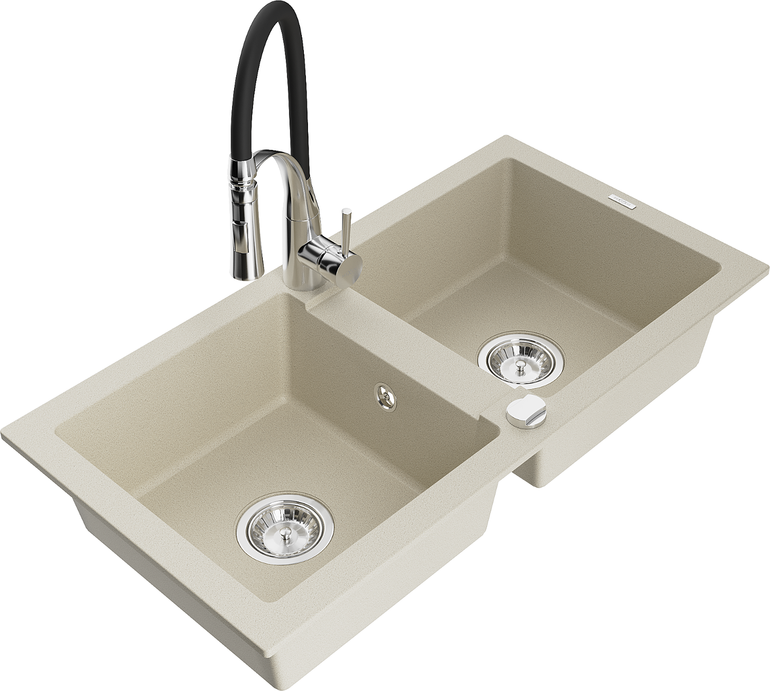 Mexen Mario granitinis dviejų skyrių plautuvės komplektas su virtuviniu maišytuvu Aster, smėlio spalvos - 6504-69-73450-07