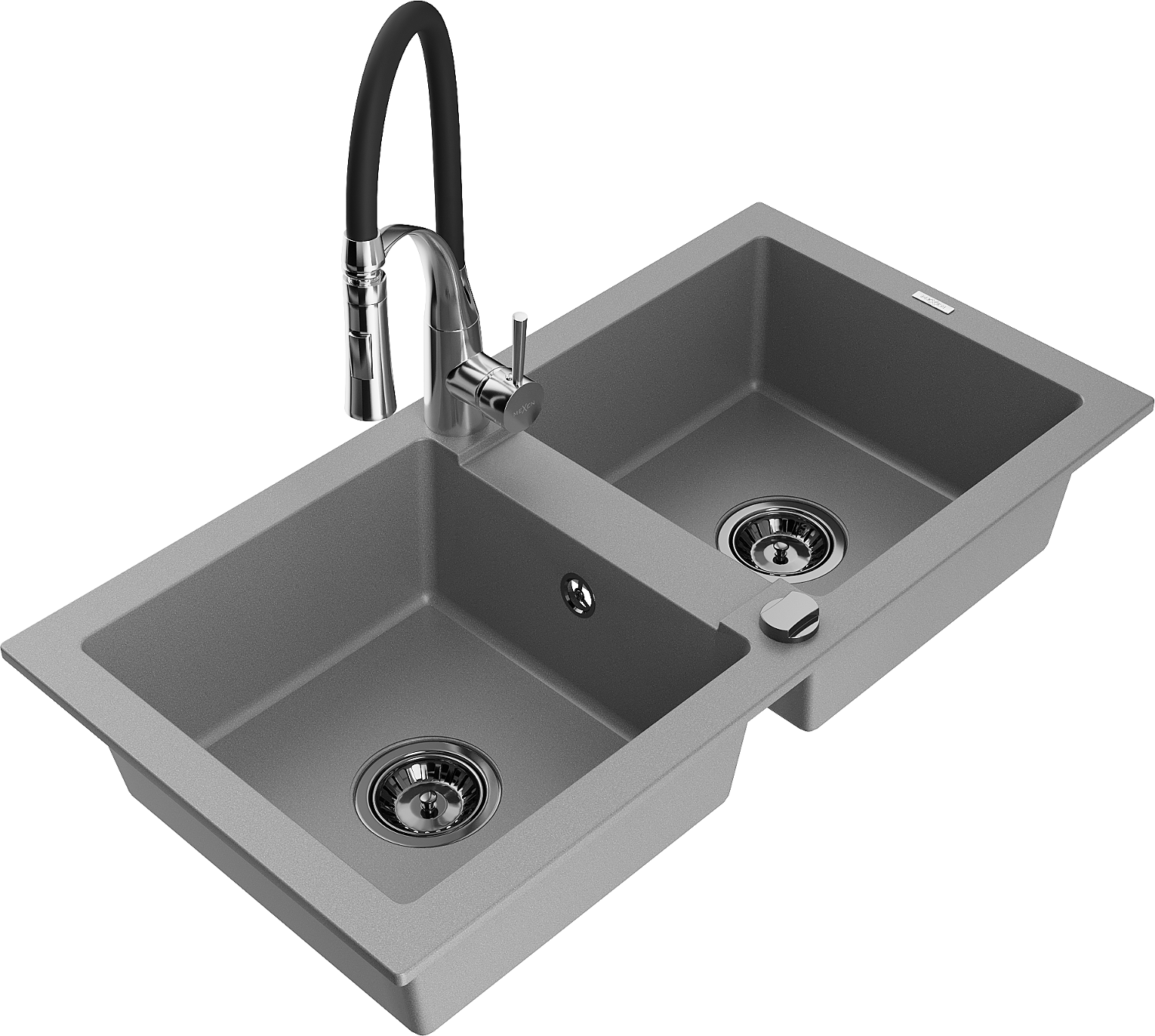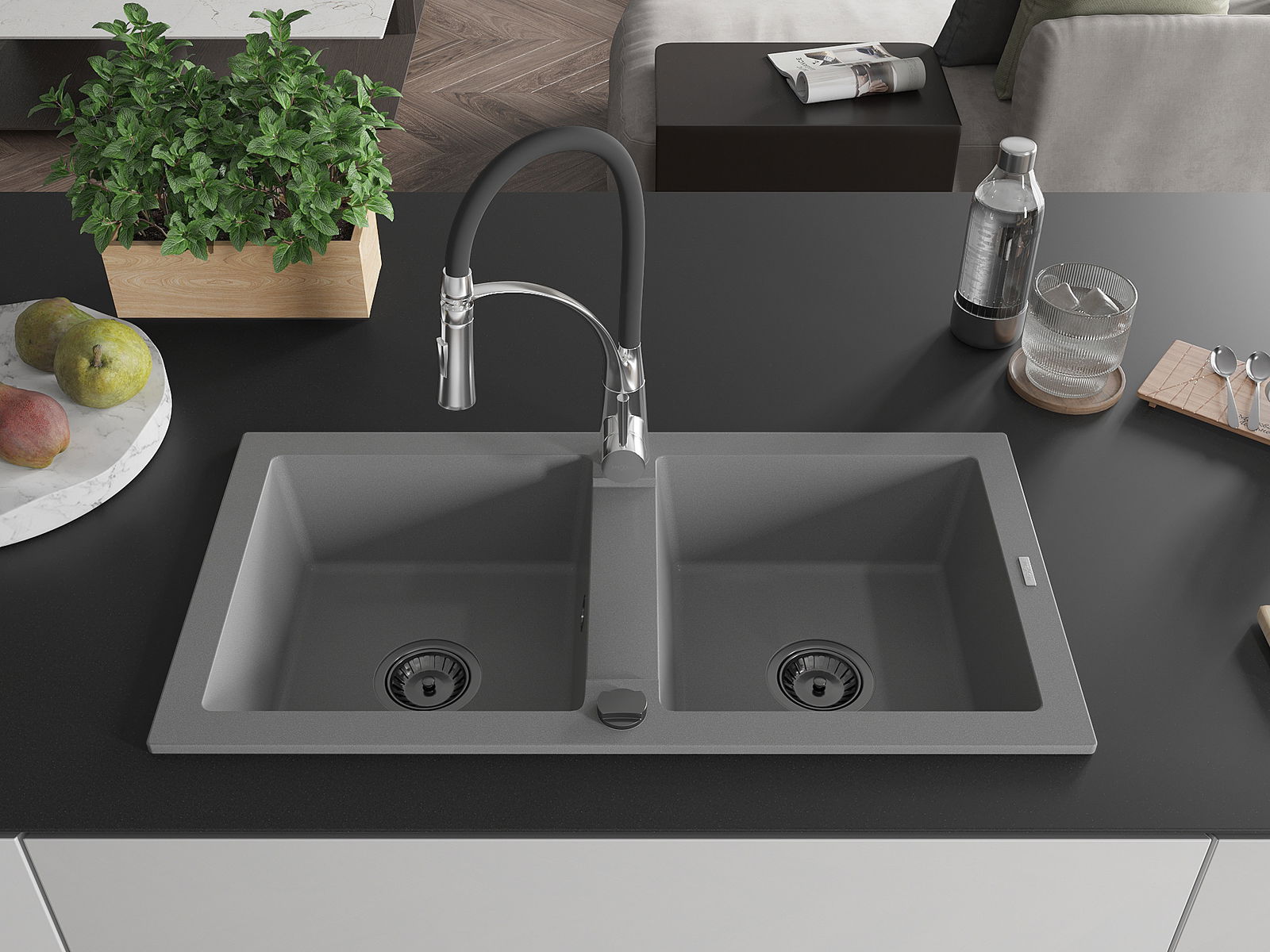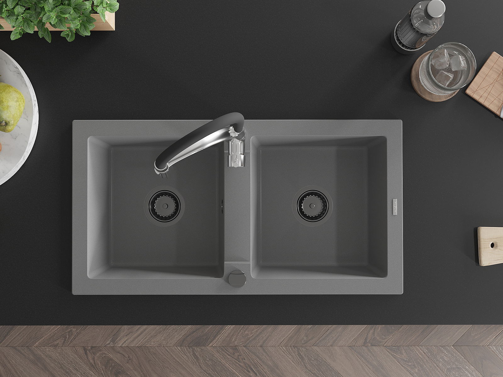 Mexen Mario granitinė dviejų skyrių plautuvė su virtuvės maišytuvu Aster, pilka - 6504-71-73450-07-B