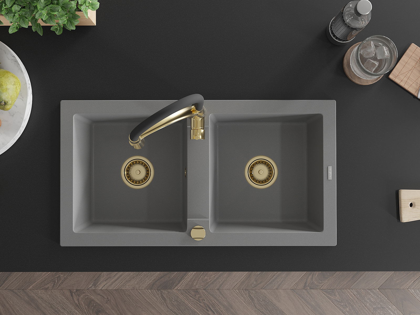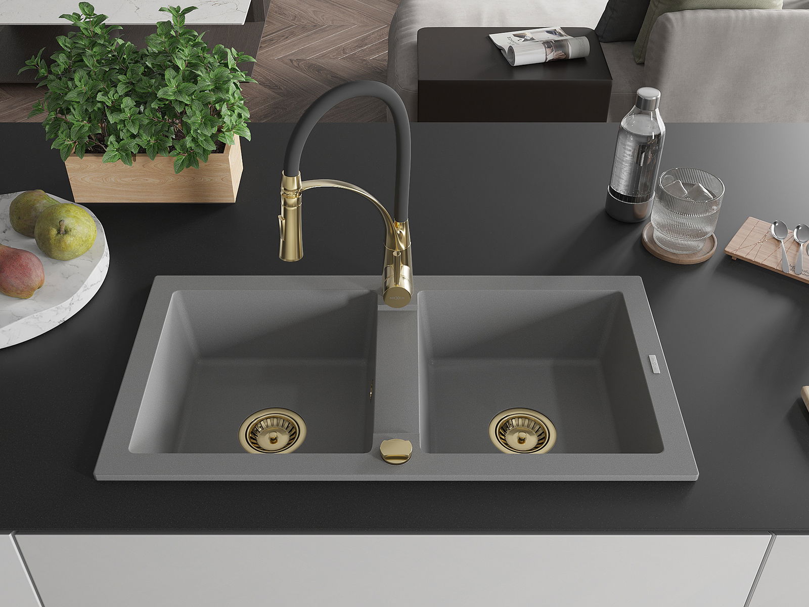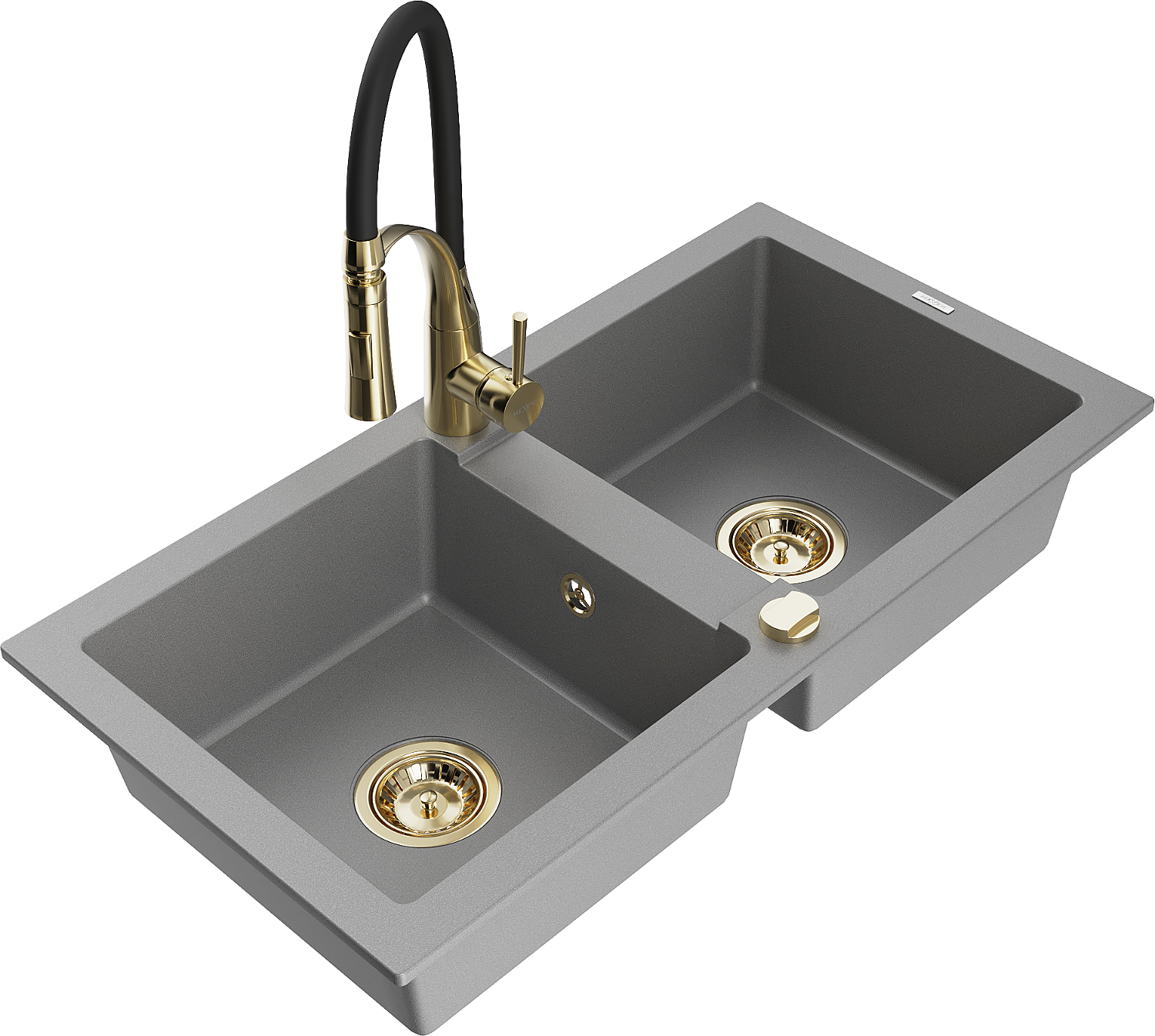 Mexen Mario granitinis dviejų sekcijų plautuvė su virtuviniu maišytuvu Aster, pilka - 6504-71-73450-57-G