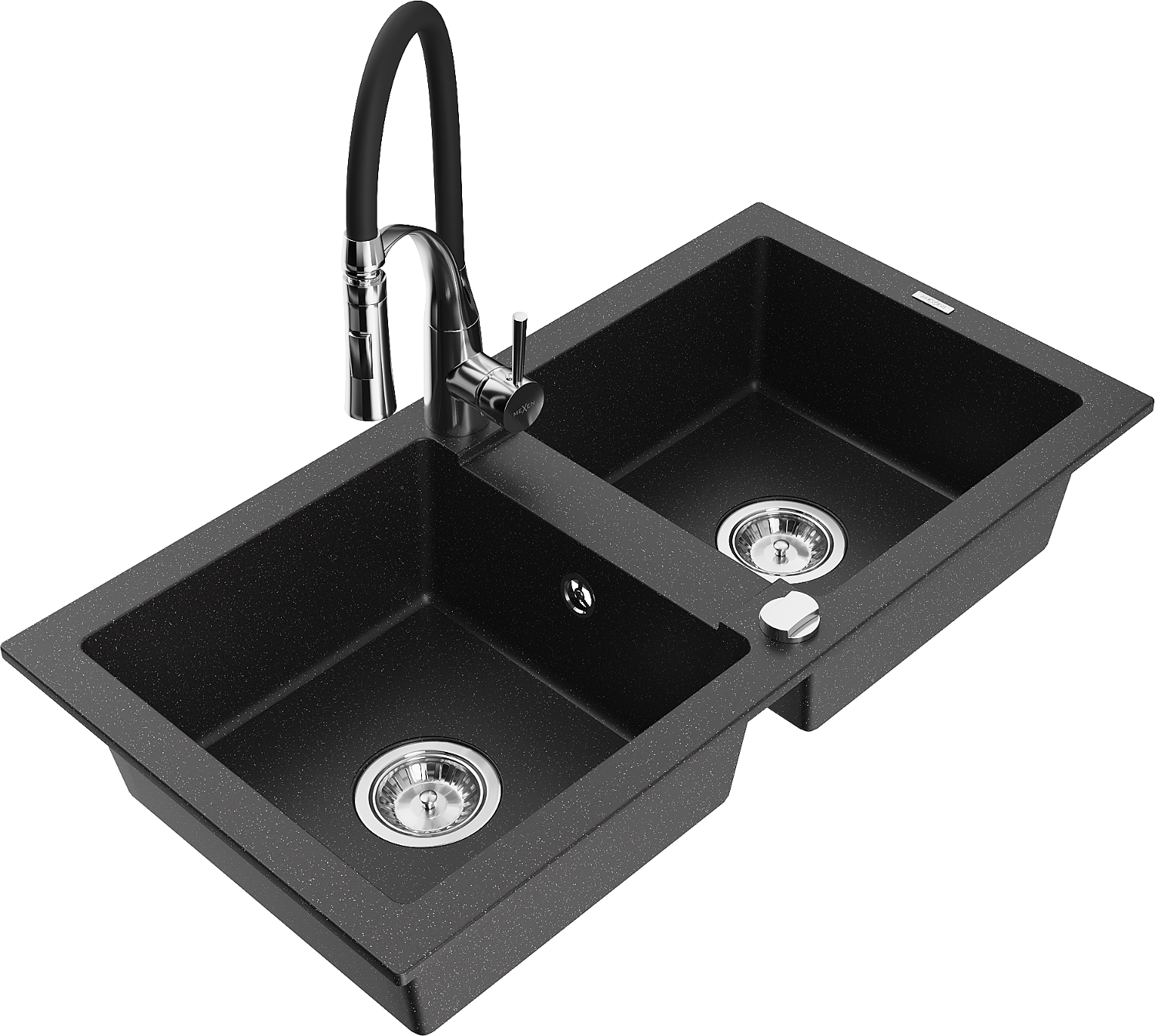 Mexen Mario granito plautuvė 2 kamerų su virtuviniu maišytuvu Aster, juoda/sidabrinis metalikas - 6504-73-73450-07